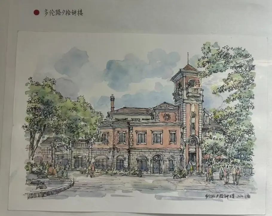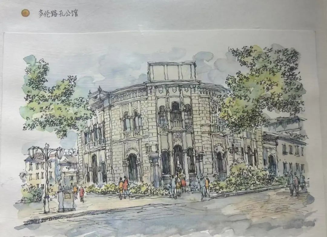 刘开海不仅是位建筑师,还是绘画发烧友,毕业于俄罗斯列宾美术学院,是中国城市规划学会和中国建筑学会的会员。他经常深入城市与乡村考察与绘画创作,并出版多本专著举办展览。这次展出的大多作品都出自于刘开海之手,他用白描和淡彩的手法,将多伦路上十多栋百年老建筑记录下来,展现了深厚的绘画功底和独特的艺术视角。
