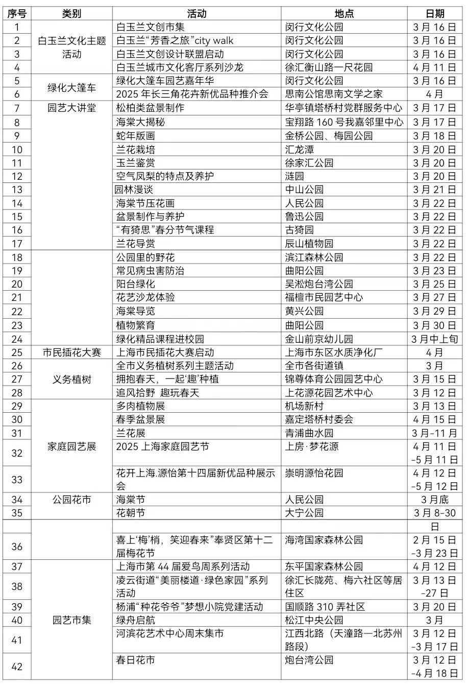 市绿化市容局介绍,2025年上海市民绿化活动月暨白玉兰文化主题活动于3月16日至4月15日举行,主要活动涵盖8大类40余场系列活动,内容丰富多样,除2025年上海市民绿化活动月的绿化大篷车、园艺大讲堂、市民插花大赛等传统品牌外,还增加了白玉兰文化主题活动、义务植树、家庭园艺展、公园花市、园艺市集等。详见↓