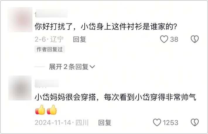 小岱的穿搭也是频频“出圈”,在他的每一条视频下面,都能看到不少人为小岱妈妈的审美点赞,还有很多网友咨询“衬衫是谁家的”“T恤是在哪买的”。