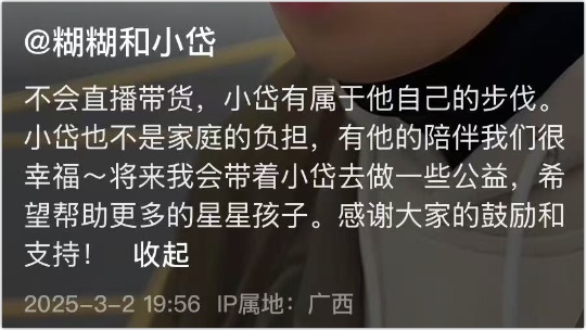 小岱走红后,有不少网友提议让他直播赚钱。面对这“泼天的流量”,小岱妈妈却坚定地表示:“不会直播带货,小岱有属于他自己的步伐。小岱也不是家庭的负担,有他的陪伴我们很幸福。”