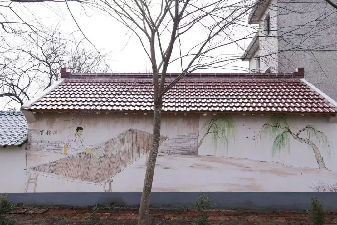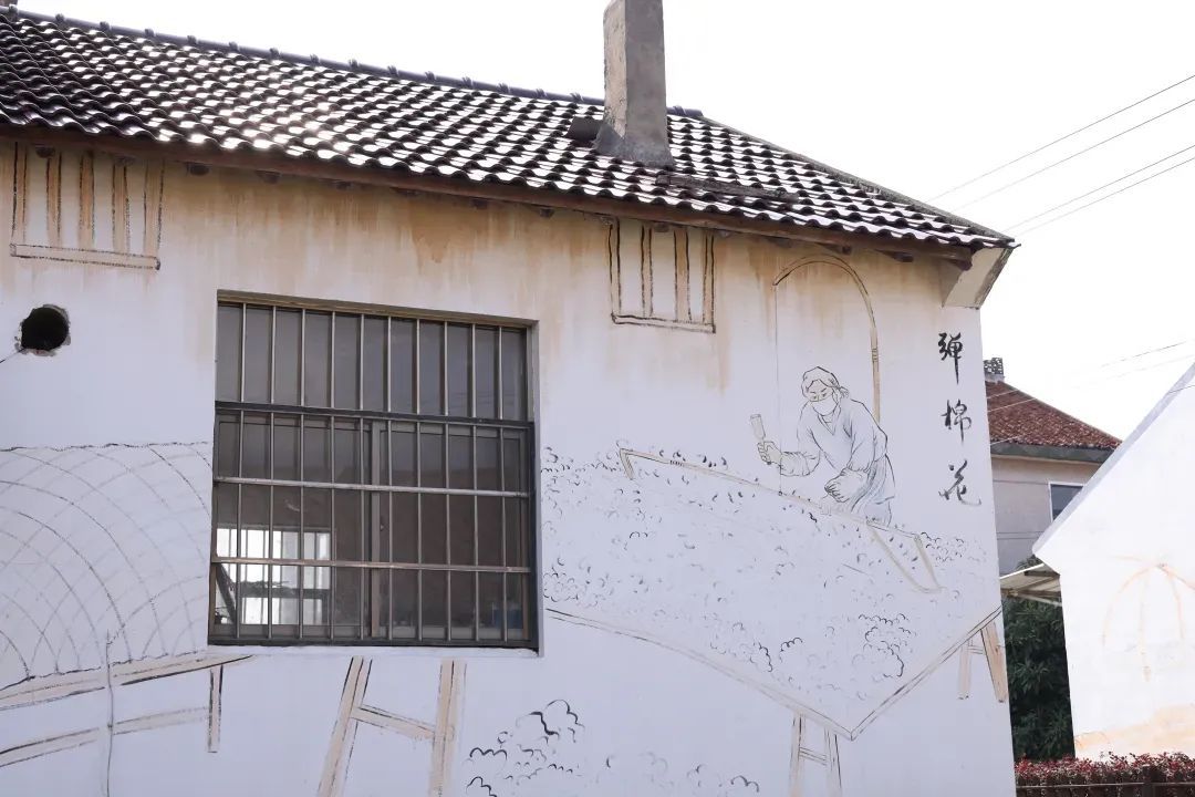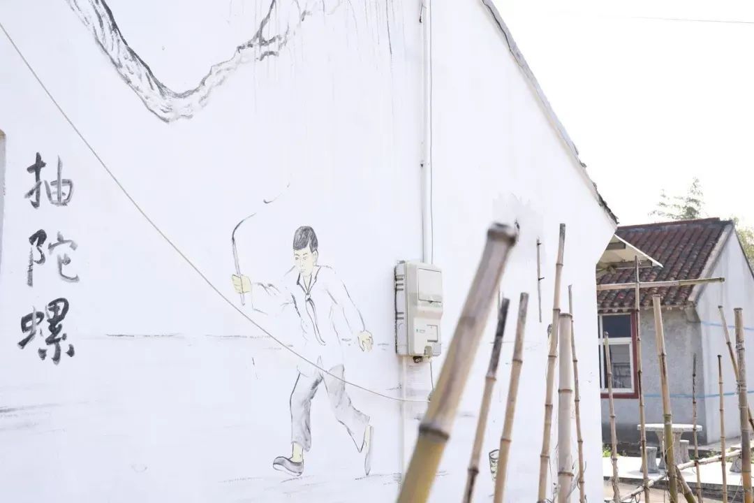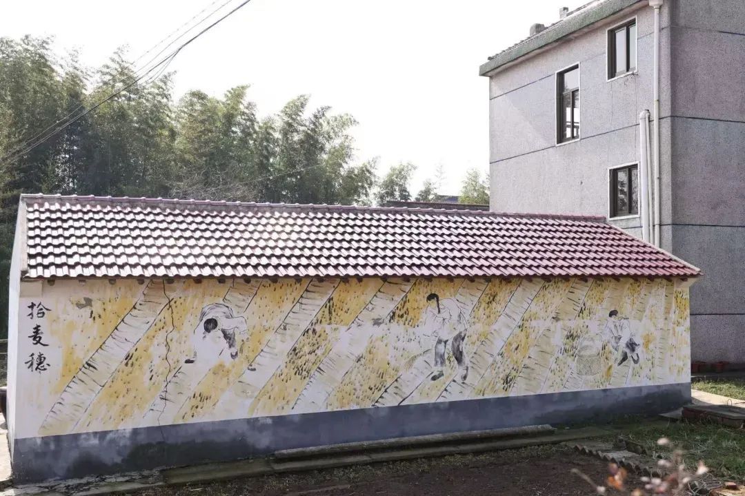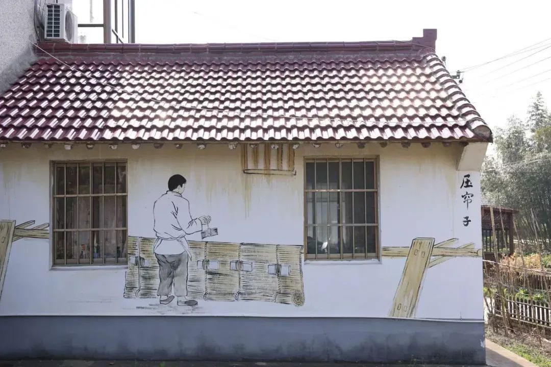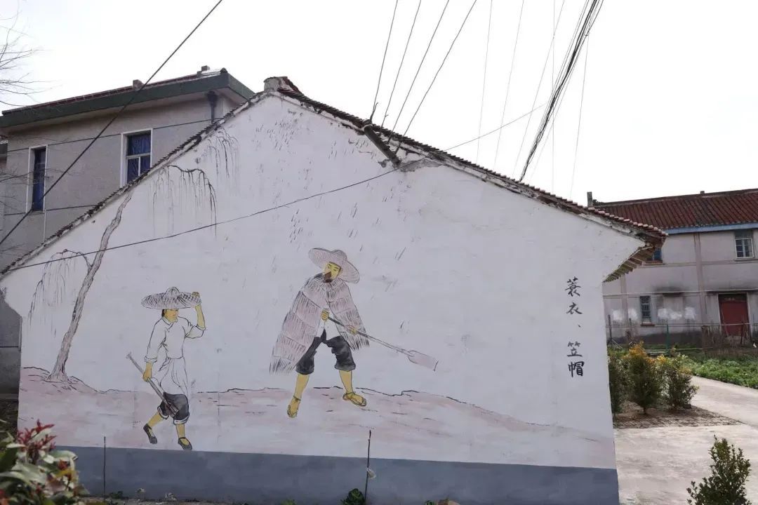 墙画的另一侧,是村民们劳作的场景。压帘子的村民弯着腰,双手熟练地编织着芦苇;拾麦穗的老人低着头,在田间仔细搜寻每一粒粮食;穿棕棚的工匠专注地摆弄着棕绳,编织出坚固的床垫……穿着簑衣、戴着斗笠的农人,他们在风雨中辛勤劳作,身影与土地融为一体。这些画面,不仅记录着以前村民们的日常生活,更展现了一种坚韧不拔的崇明精神。