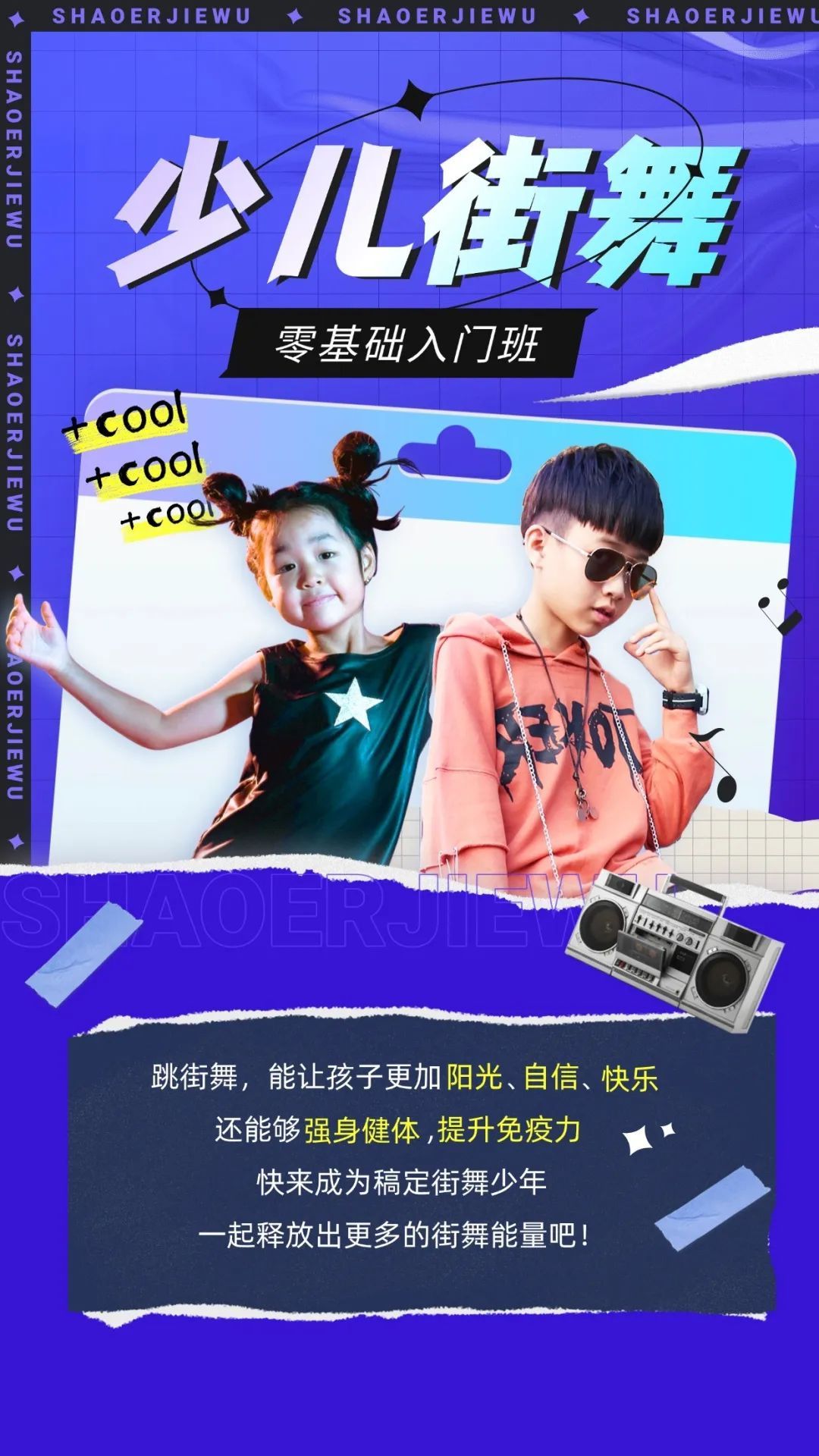 少儿街舞项目基于健康文化的兴起,由专业老师进行指导,教孩子超简单的健身舞蹈动作,零基础跟练,简单易学,节奏比较慢,难度较低又带有少儿的肢体特色,适合少儿学习。能培养孩子们的动作协调性和舞感,以及肢体灵活性,提高协调能力。