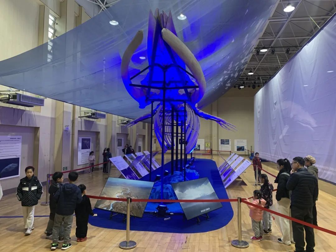 开放首日,观众们一踏入展馆,便围拢到亚洲最大长须鲸骨骼标本旁边,这具庞大的骨骼标本气势磅礴,仿佛每一根骨骼都在诉说着海洋的悠远故事。馆内还展示了鲸鱼的外形、习性、迁徙路线等,呈现了它们的生存困境与保护现状。一幅幅精美的图画,一段段生动的视频,还有充满科技感的AI互动装置,令观众置身于鲸鱼的奇妙世界。