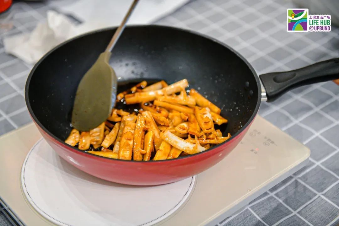 比赛中,居民“大厨”不仅展现了高超的厨艺,还融入了日常生活中多年的烧菜经验。比如油焖春笋这道菜,有的“大厨”更倾向于浓油赤酱,有的则偏好清淡口味;而在烹饪西芹炒豆干时,有的“大厨”选择先将豆干焯水再炒,有的则直接下锅,可谓“百家百味”,展现了家常菜的多样性与个性化。