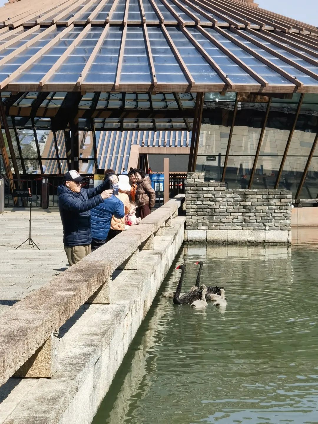 不仅市民感受到春意后迫不及待地外出踏青,动物也不甘落后,纷纷出来晒太阳。只见富林湖中的黑天鹅夫妇带着5只宝宝游至岸边,优雅地接受游客投喂。