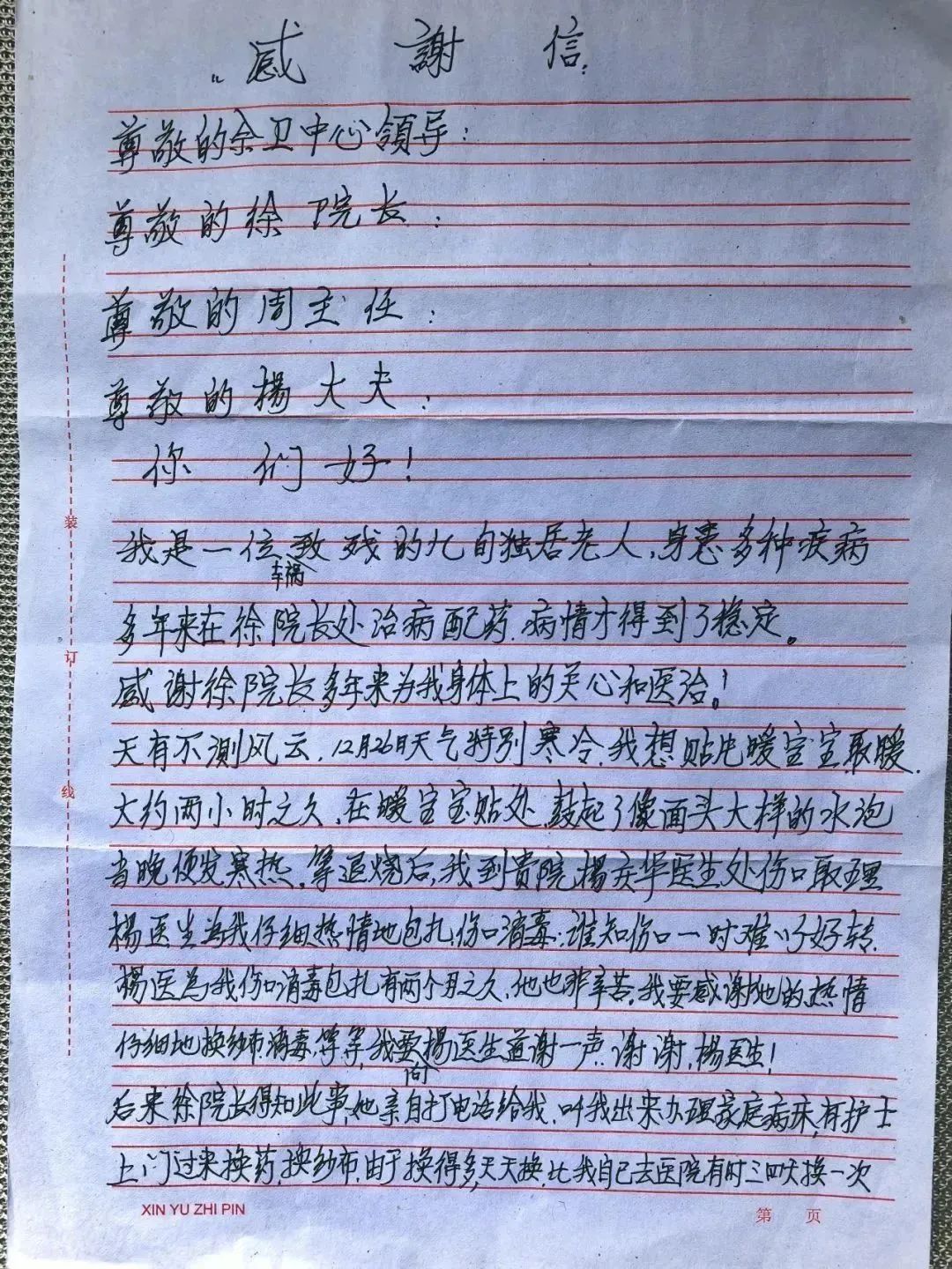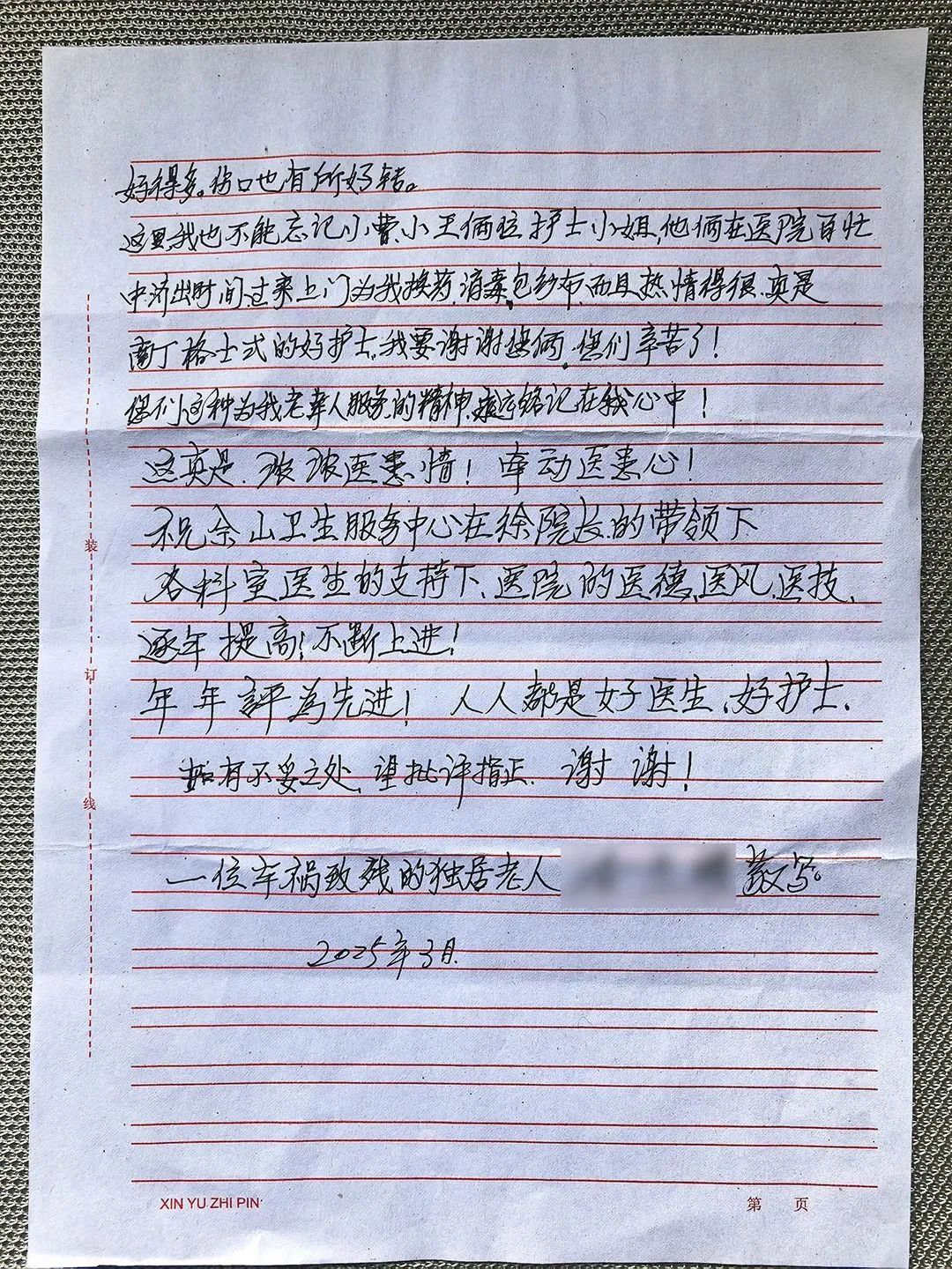 潘爷爷深受感动,于是亲手写下了这封感谢信。中心医护人员表示,这封信不仅是对大家工作的认可,更是激励自己继续前行的动力。今后将秉持初心,不断优化服务流程,拓展服务项目,为更多患者送去健康与便捷。