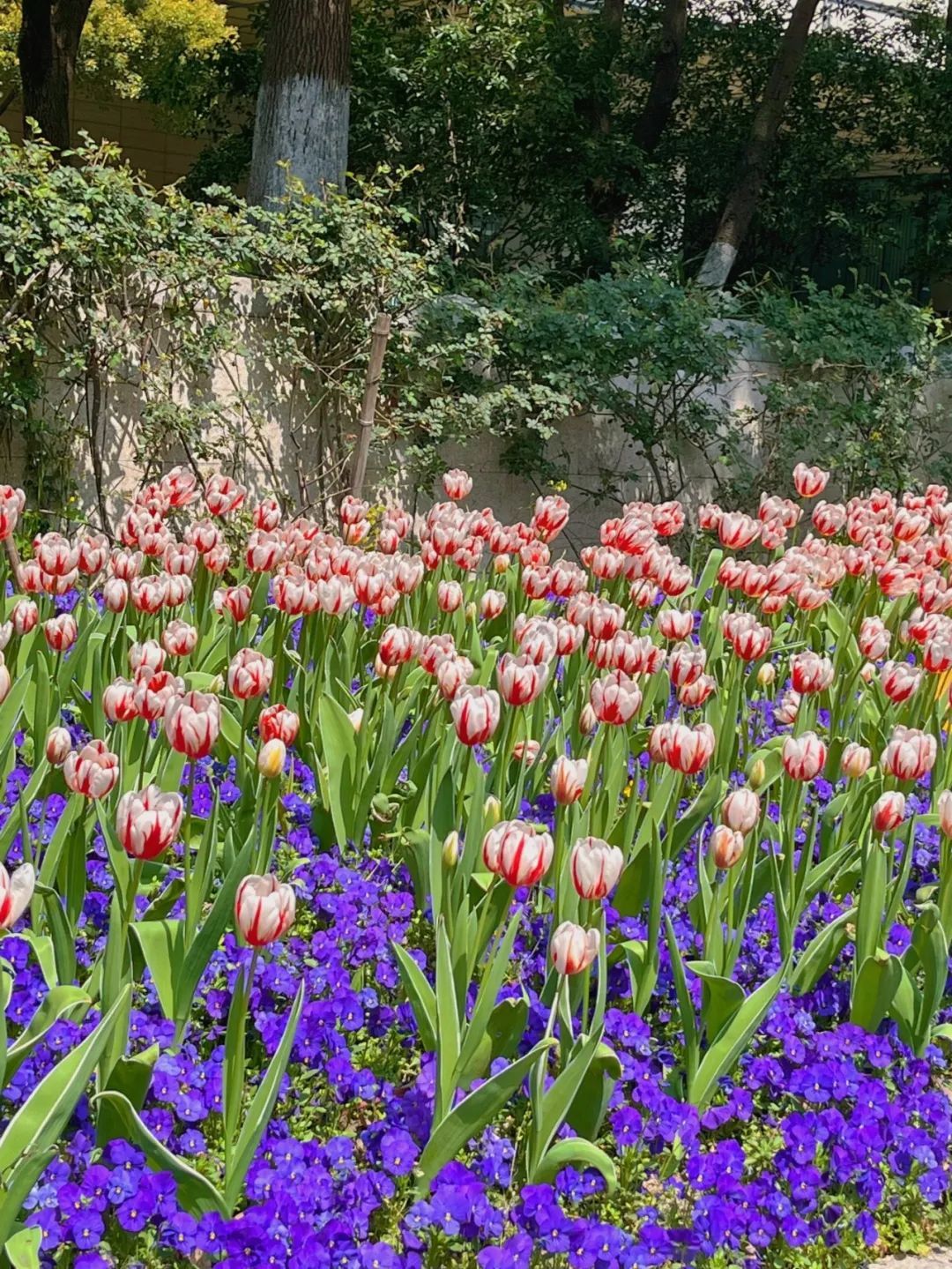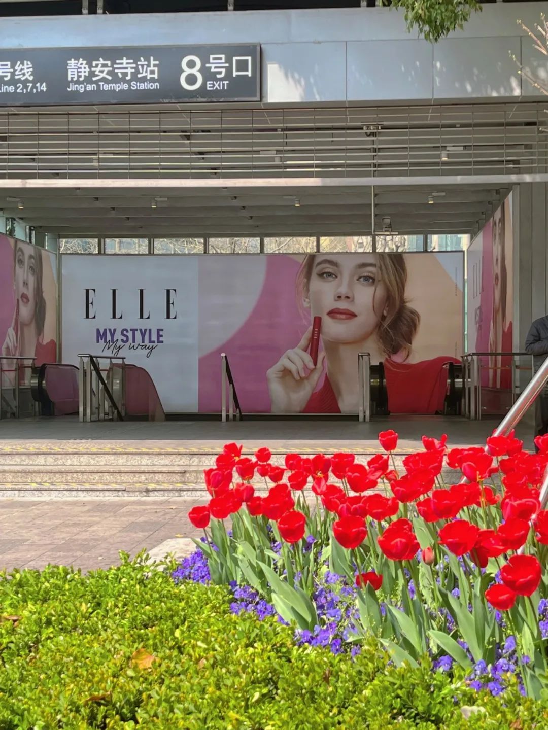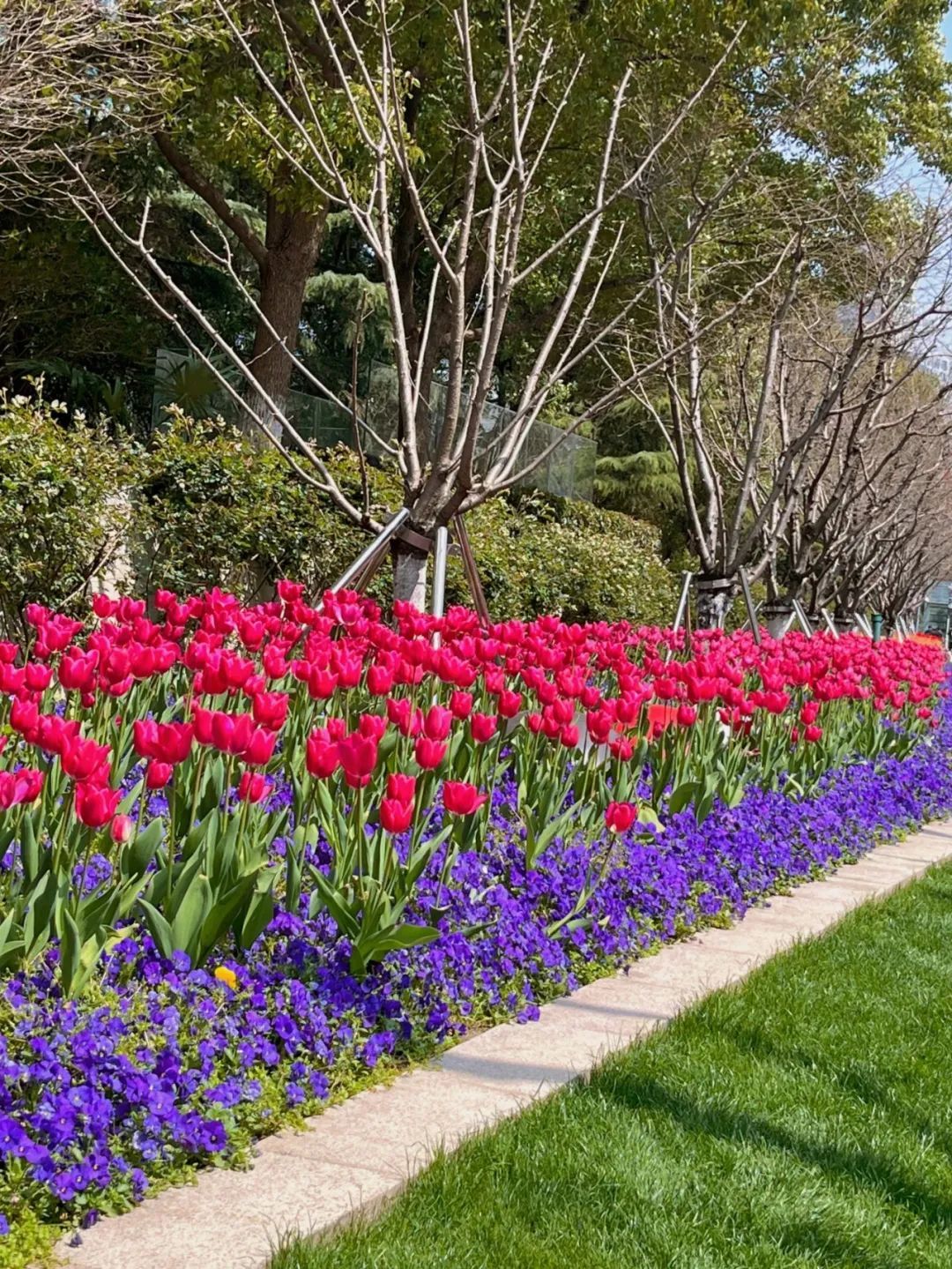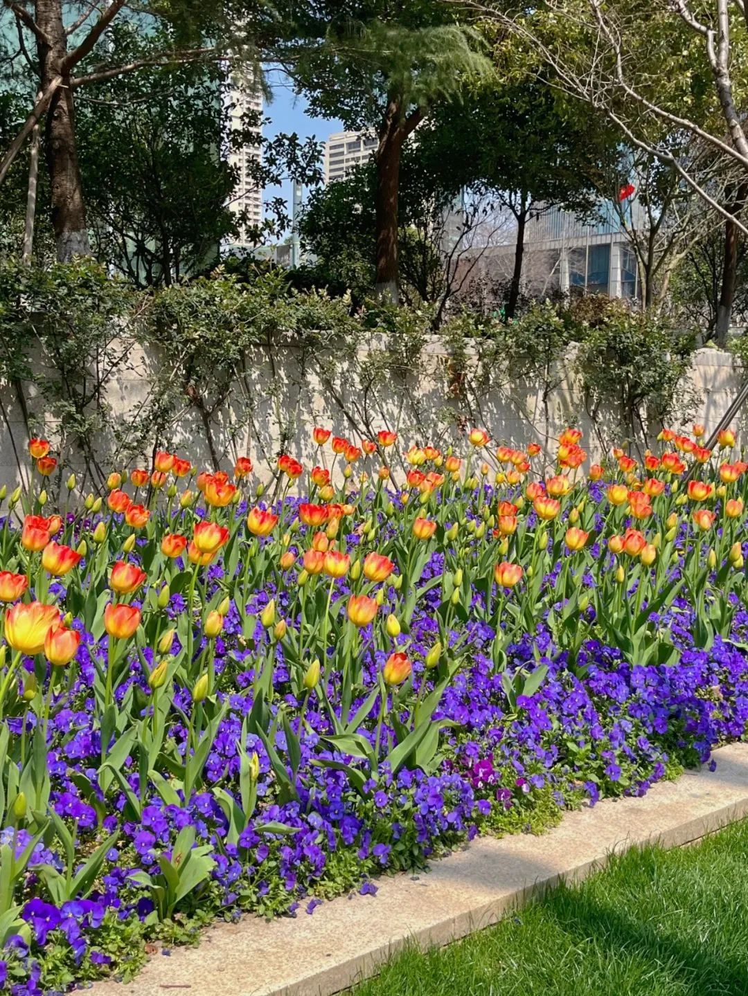 当现代商圈遇上春日郁金香花带,沿街铺展的各色郁金香与静安寺商圈充满时尚感的建筑外立面构成静安专属的“都市浪漫”。