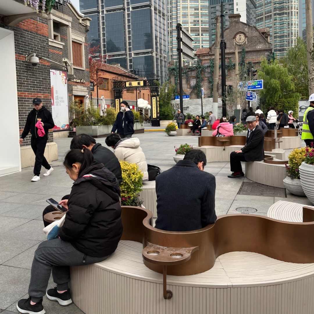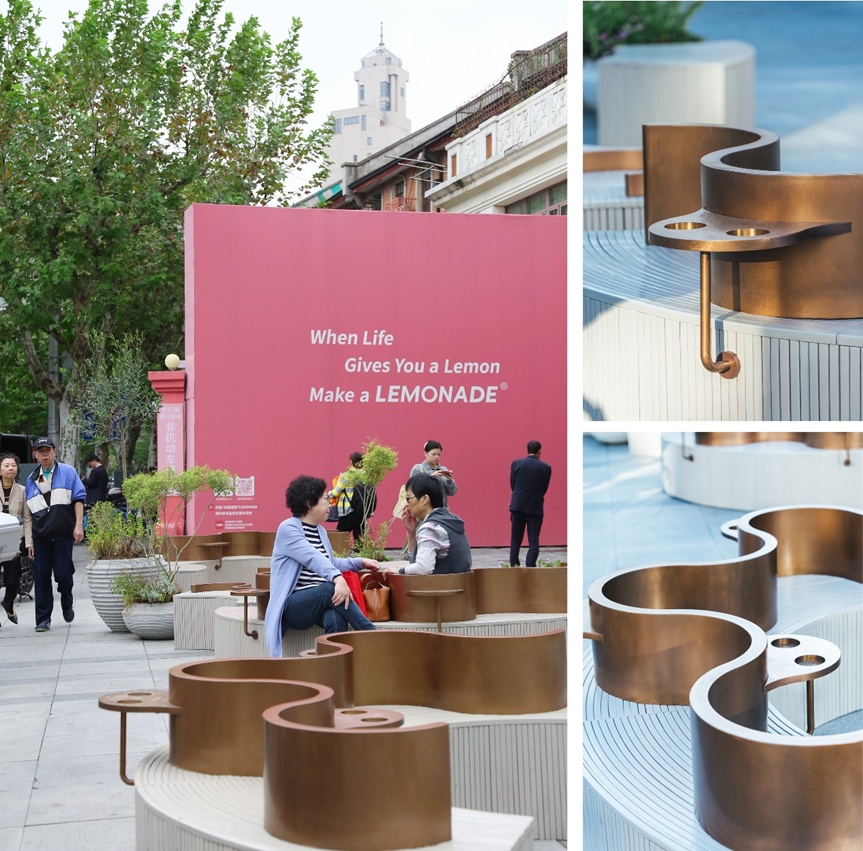 在威海路“美丽街区”景观提升项目中,静安区绿化市容管理部门在地铁12号线南京西路站出入口广场上设计了“花瓣座椅”,汲取了花朵“花瓣褶皱”的自然灵感,椅背以温婉流畅的花瓣形态优雅地环绕出座位区域,同时,分隔内外座位空间,搭配小圆桌和考究的植物,让地铁口化身为艺术气息浓厚的歇脚处,在这里喝杯咖啡、晒晒太阳都成了浪漫仪式。