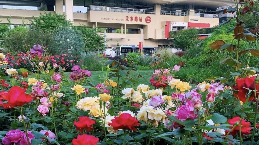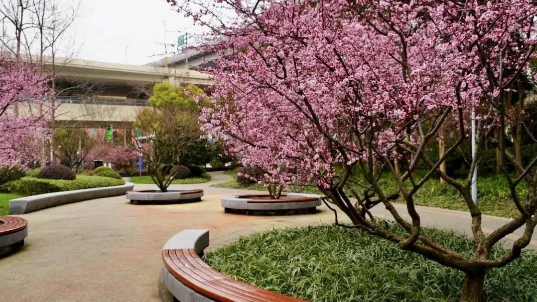 整座公园分为春、夏、秋、冬四个主题景观园,2月红梅如绯云漫卷,3月美人梅接力上线,4月染井吉野樱粉白交织,5月进入“月季时间”,秋冬季银杏金黄、槭树绚丽,立交桥下“自然画框”处处藏着“站台外的四季”。