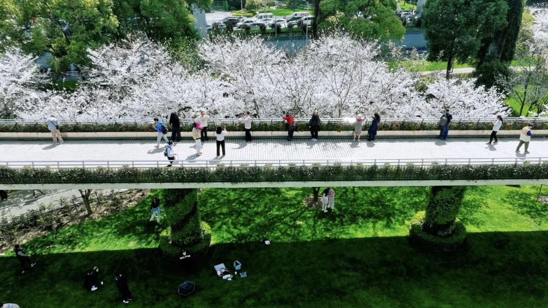 这个以樱花为主题的“春景”街心花园,在过去数年是周边居民的休憩地,如今又成为申城无数摄影爱好者眼中的“浪漫出片地”——天桥扶梯、钢木廊架与花影交错,随手一拍便是电影感十足的春日大片。