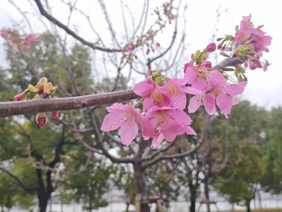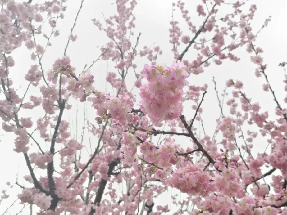暖阳透过稀疏的云层,洒在成片的樱花树上,每一朵樱花都好似在“梳妆打扮”。