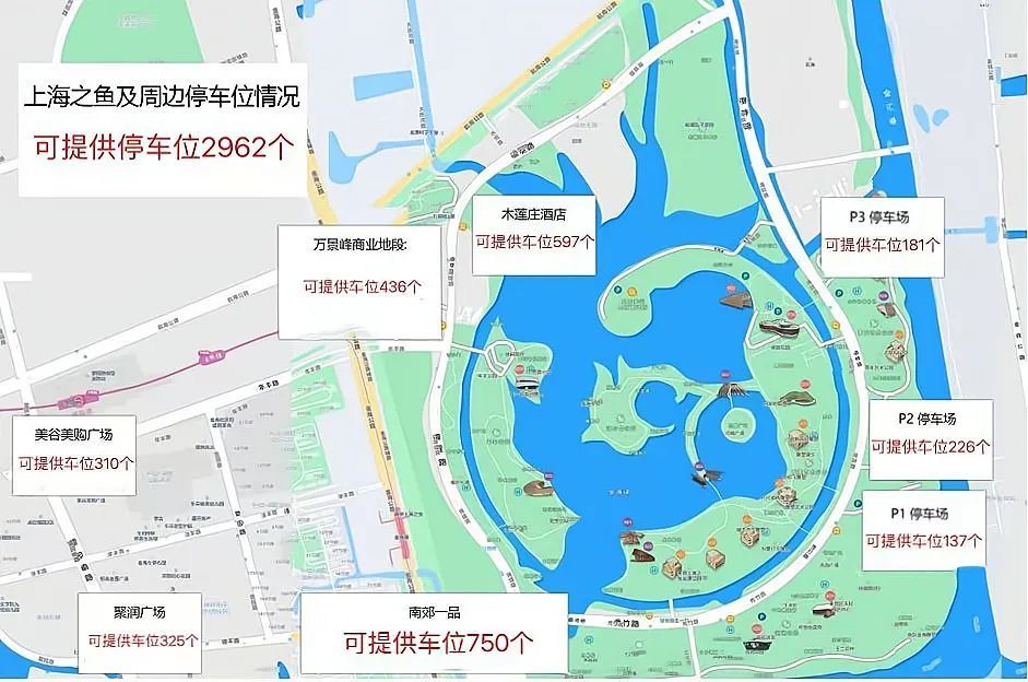 为保障市民游玩便利,小编为您梳理了上海之鱼周边停车及出行指南↓ 【安全倡议】 一、错峰出行少拥堵 1.拥堵路段不鸣笛,减少噪音护和谐! 2.实时导航查路况,绕行拥堵更高效! 3.拼车出行减流量,低碳环保两相宜! 二、停车规范不添乱 1.即停即走不拖延,安全通行有保障! 2.机非停车禁占道,资源错用引纠纷! 3.景区周边有接驳,绿色出行省烦恼! 三、安全细节莫忽视 1.行车要系安全带,儿童座椅护未来! 2.雨天路滑降车速,保持车距防事故! 3.手机勿扰专注驾,分心一秒险万分! 心宽路更宽,守法即捷径! 你我多一份耐心,景区多十分畅通! 【停车信息】 固定停车场 P2停车场:湖畔路50号(泡泡公园与青年公园中间),总车位226个 P3停车场:湖畔路与金海河桥交叉口往南30米(青年公园北约50米),总车位181个 万景峰商业停车场:湖堤路199弄,总车位590+436个 停车收费标准 P1/P3停车场:3元每小时封顶24元(小型车)/4元每小时封顶32元(大型车) P2停车场:5元每小时封顶40 南郊一品停车场:2元每小时封顶16 聚润广场停车场:2元每小时封顶16 美谷美购停车场:5元每小时封顶40 木莲庄酒店停车场 :免费 【公共交通】 金海湖游览专车: 地铁出行: 【便民信息】 滴滴出行推出【往返上海之鱼享滴滴5折优惠】活动! ✅ 即日起至6月30日,每7天可领1次,每次领取后7日内使用。使用滴滴出行app或者小程序,出发地或目的地设为“上海之鱼”,可享打车5折起的活动。 示例如下: 【温馨提示】 周末10:00~15:00为客流高峰,建议优先选择P1~P3停车场或地铁,如遇交通管制,需听从现场民警指挥。