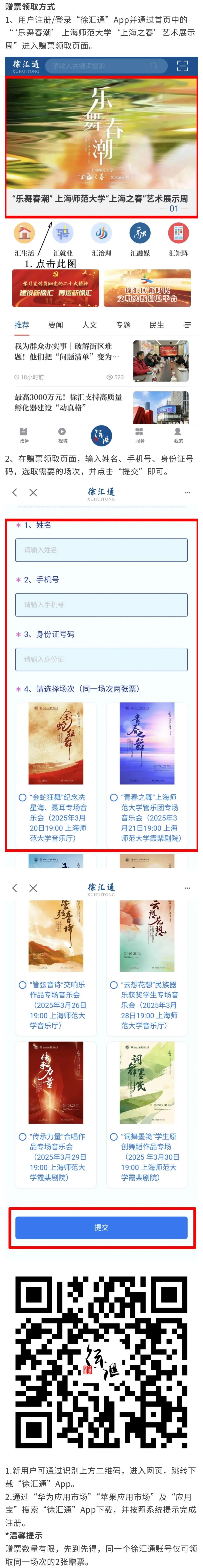 请用户注册/登录“徐汇通”App并通过首页中的“‘乐舞春潮’上海师范大学‘上海之春’艺术展示周”进入领票领取页面。在页面填写姓名、手机号、身份证号码,选取需要的场次,并点击“提交”即可。我们将为每人送出上海师范大学“上海之春”艺术展示周观演票2张(数量有限,先到先得)。