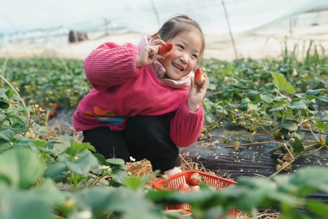 3月8日,在江苏省盱眙县天泉湖镇陡山村,游客在草莓大棚内采摘草莓