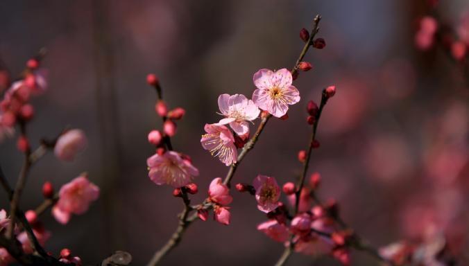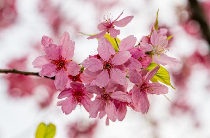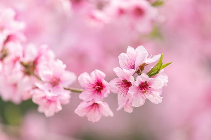 但是相较于梅花,桃花花瓣尖尖的,开花时会有小绿叶。