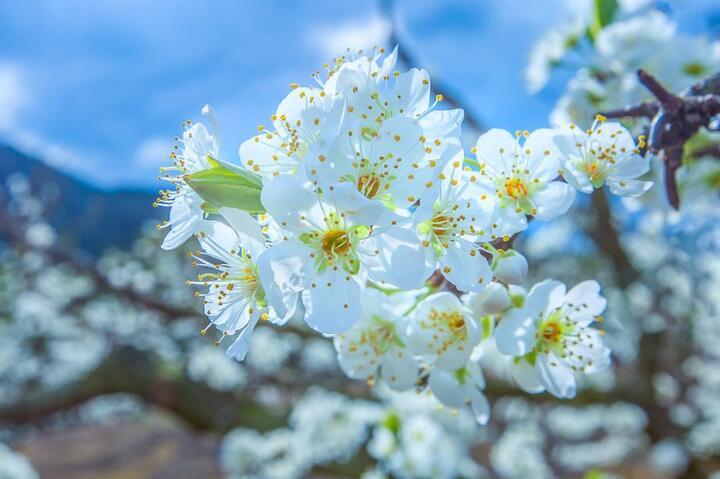 梨花成簇开放,啮齿状的花瓣边缘不整齐。