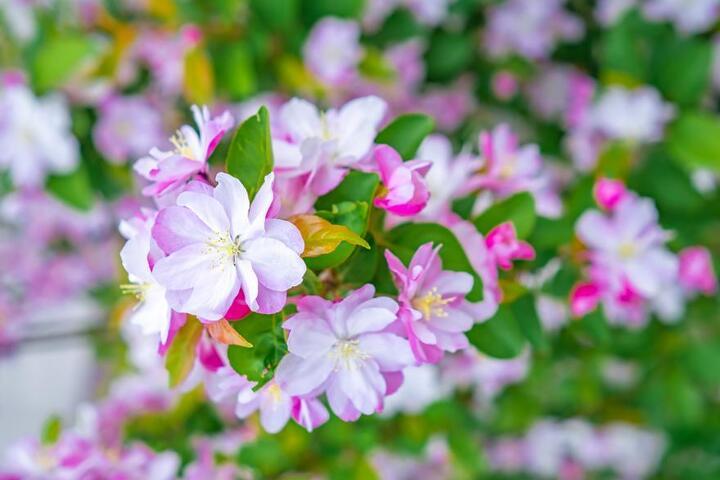 海棠品种繁多,其中西府海棠、垂丝海棠、贴梗海棠和木瓜海棠,被称为“海棠四品”。图中的是垂丝海棠。