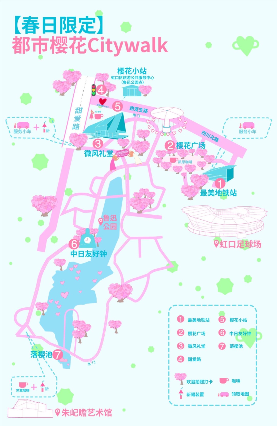 沿着鲁迅公园的樱花步道,依次邂逅最美樱花地铁站、樱花广场、落樱池、中日友好钟、微风礼堂、甜爱路、樱花小站七大赏樱点,于花影斑驳间,定格春日限定的诗意画面。