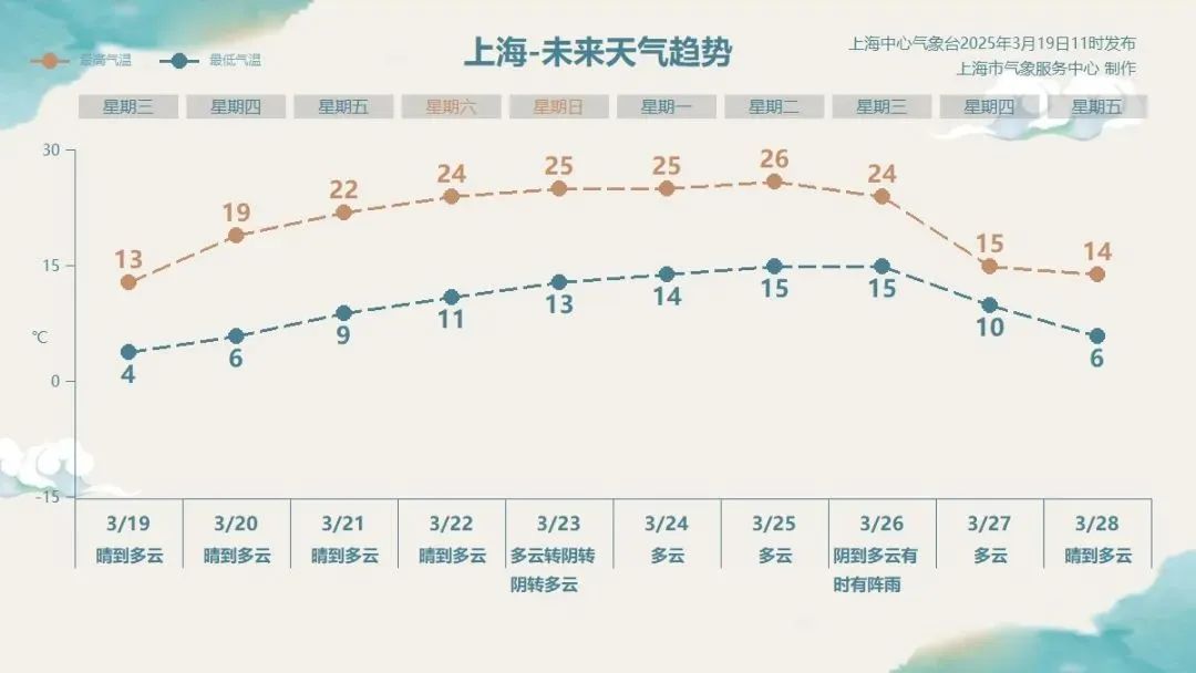 天气趋势:未来十天,本市以晴或多云天气为主,根据上海市气候中心预测:3月下旬到4月初,本市樱花(中晚樱)、桃花等花卉进入初花和盛花期,晴好天气非常适合出游打卡。 明天起气温更是“芝麻开花节节高”,双休日和下周初的午后甚至会有初夏体感。需要注意的是,虽然大幅度回暖,但昼夜温差拉大,白天暖意融融,早晚还是有点冷。 另外,下周周中有一股冷空气到来,上海天气又会上演“过山车”。早春时节,天气多变,很容易诱发心脑血管、感冒等疾病,穿衣方面还需谨慎,不要减得太多太快。