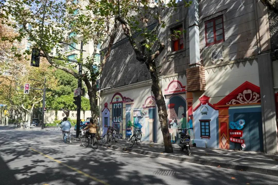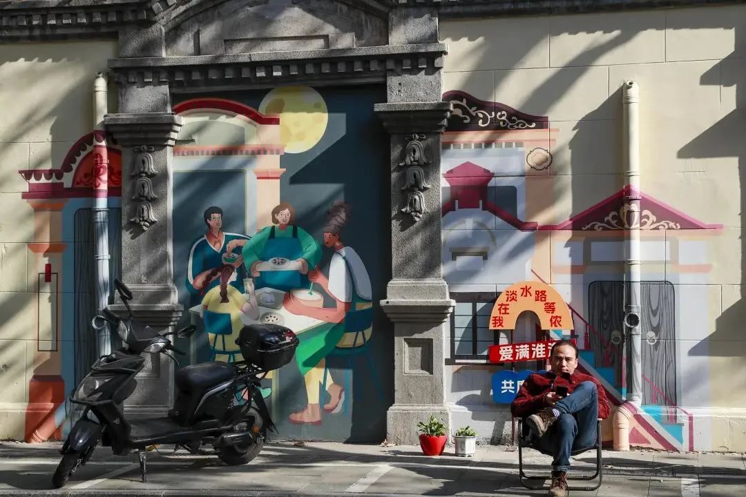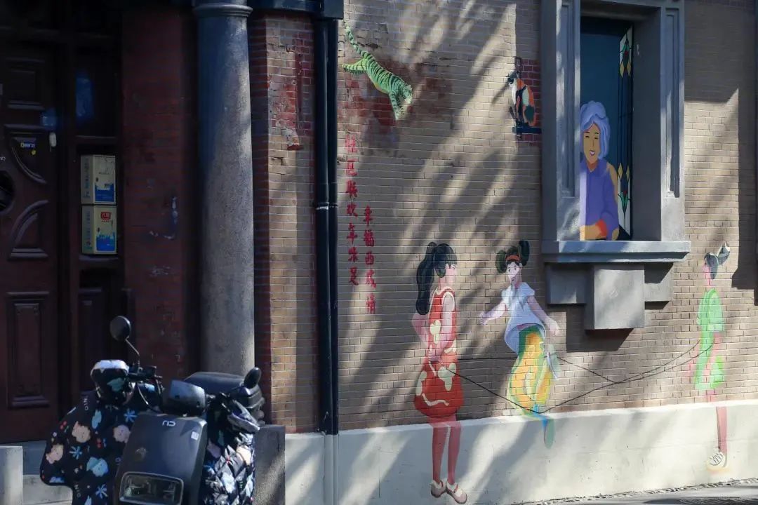 在自忠路与淡水路交口的东南侧,是在2022年完成旧改的石库门里弄小区西成里。由于地块情况较为复杂,西成里旧改基地在三五年内不会有太大变化,但它一街之隔就是新天地等商业体,对街也有不少小店,简单地围挡板、封水泥会破坏街区风貌、降低吸引力和热度。如何将这样的“小、精、美”城市空间利用起来呢?淮海中路街道聘请专业人士,从西成里的故事中找灵感,设计了一片反映上海里弄生活的墙绘,一个个充满海派文化氛围的场景跃动在墙壁上,吸引力不少人前来打卡。