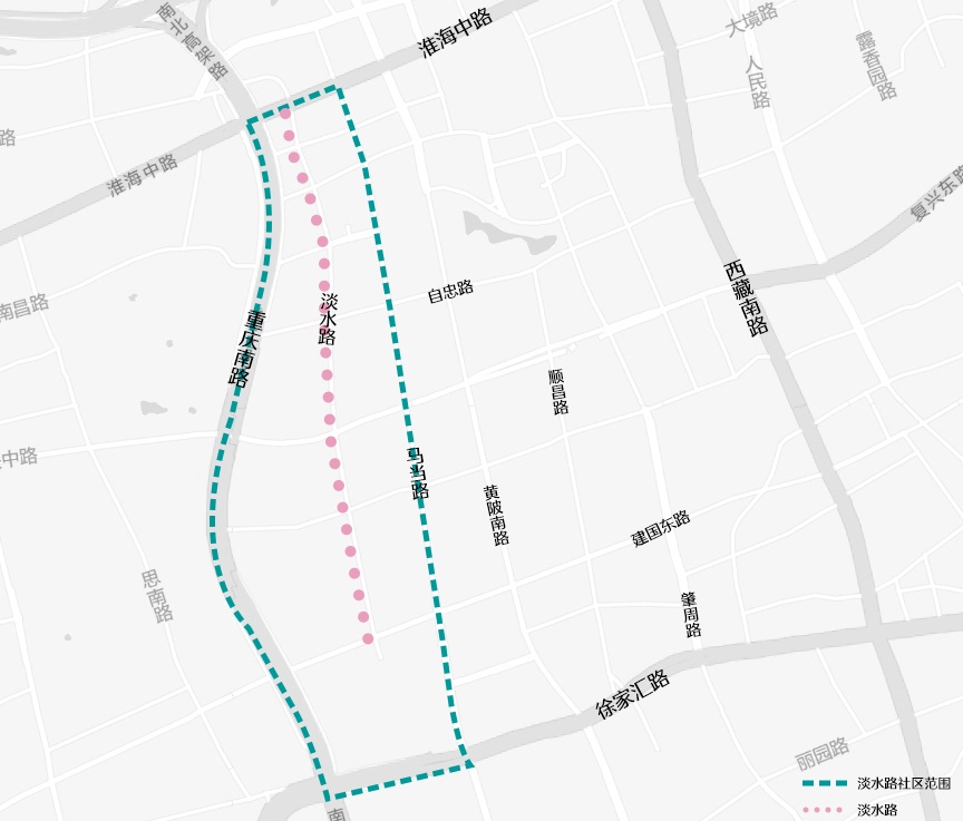 淡水路社区位于淮海中路街道西部,北起金陵西路、东抵马当路、南临建国东路、西靠重庆南路,占地面积0.33平方公里,由27个居民小区组成,实际居住人口0.8万人左右,隶属于淮海中路街道。