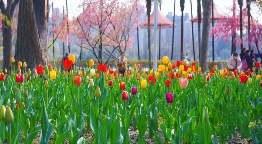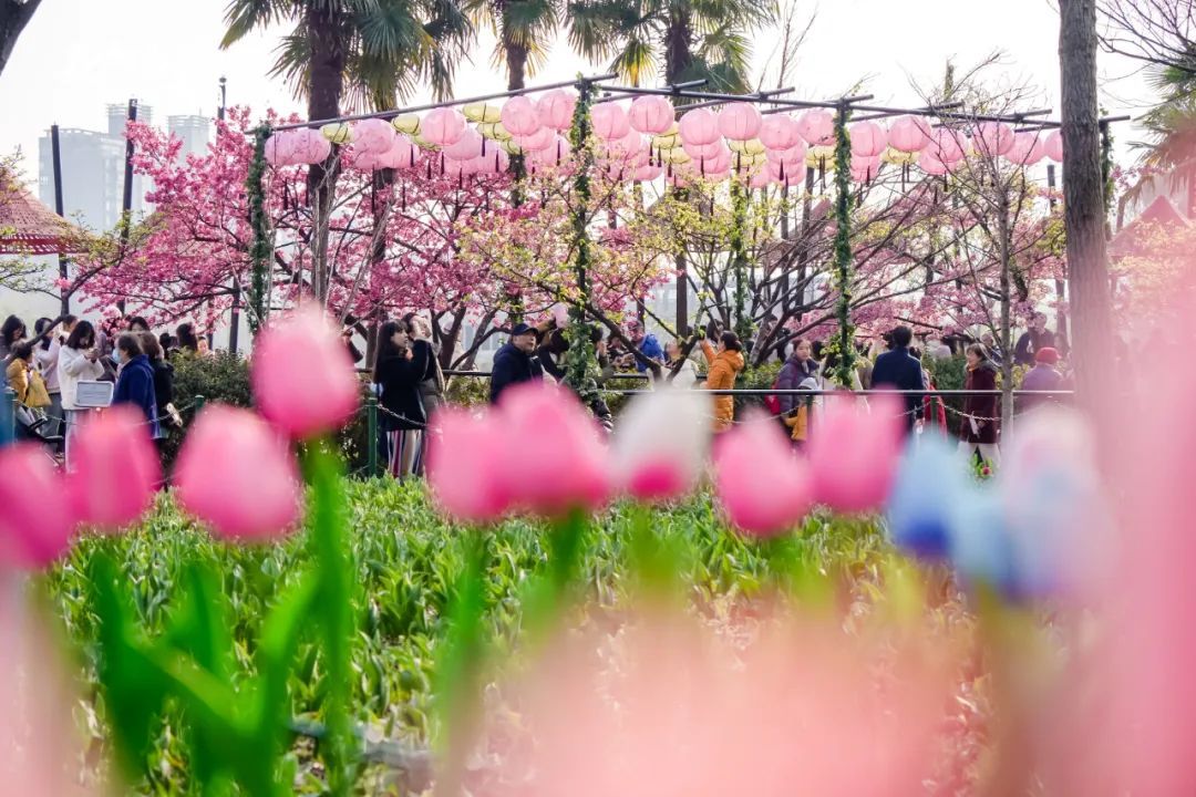 眼下,正值大宁公园樱花、海棠、白玉兰等春季花卉的盛花期,约1.2万平方米的百万株郁金香也已芬芳成海。
