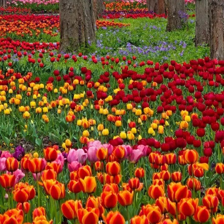 方塔园郁金香花展上,4万株郁金香组成巨型调色板,20种花色从胭脂红到月光白渐次铺展,营造出一步一景的赏花体验。
