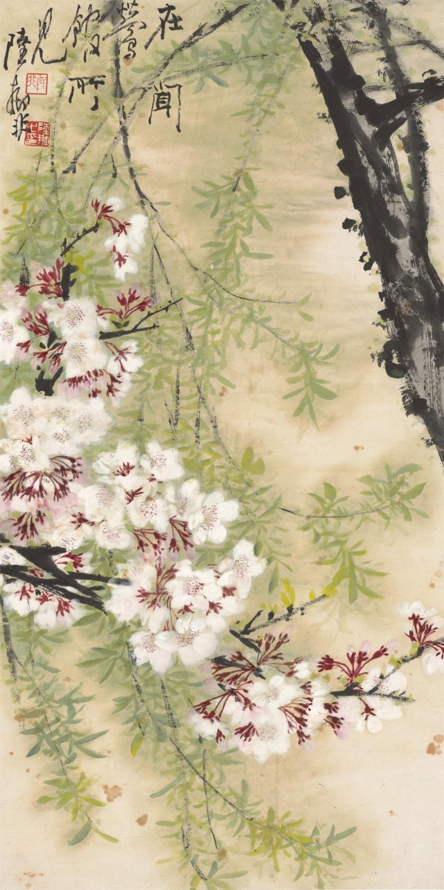 闻莺馆位于西湖十景“柳浪闻莺”公园内。作品构图疏朗有致,右上角用墨绘之的粗犷树干与左侧细腻的粉色樱花相对。樱花枝干与柳树的枝叶自然融合,支撑全画。画面中元素秩序井然。颇具质感的树干,朵朵绽放的樱花,嫩绿的柳叶,相映成趣,错落有致,造成画面的空间感,显示出画家对位置经营的匠心。全作赋彩丰富,营造出春色满园、生趣盎然的画面氛围。