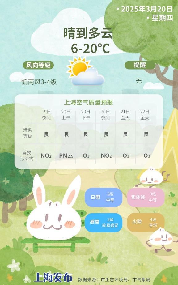 今天晴到多云,早晨最低气温升至6℃,白天南风徐徐,气温也跟着水涨船高,可上升到20℃。早上出门还有微寒,中午就一派暖意融融。相对湿度80%~25%。是标准的春天的样子,宜洗衣晒被,享受阳光!