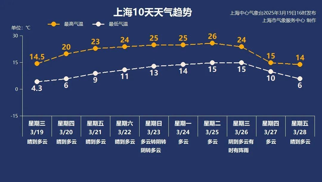 3月23日(周日):多云转阴转阴转多云,13~25℃