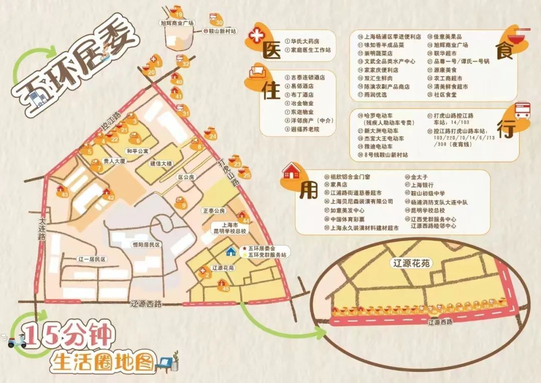 据悉,“15分钟生活圈地图”以“医、食、住、行、用”为分类标准,分别标注了该类别所有的生活信息,如“医”指明在控江路上有华氏大药房,位于辽源花苑小区内的江浦社区卫生中心五环卫生点,可以提供看病、诊疗、理疗、挂水、配药等全方位医疗服务。在打虎山路上有新开张的杨浦区社区长者食堂,如果想自己买菜烧饭,打虎山路上还有彩虹集市和农工商超市。“行”则标注了销售电动自行车的店铺和周边公交车站的信息。“用”的方式则更加丰富,周边有辽源党群服务中心、辽源西路社区睦邻中心、昆明学校总校等社区资源,社区居民步行15分钟内,就能享受这些公共服务资源。