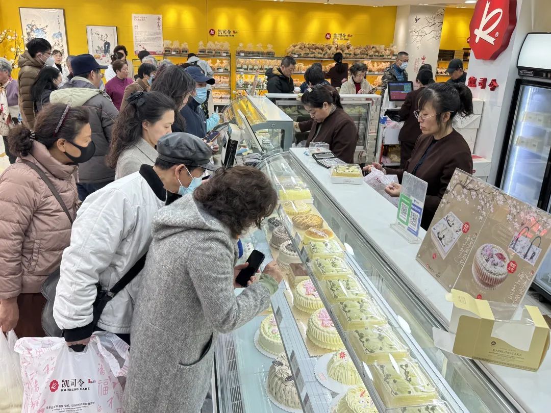 店内工作人员介绍,这款新品一推出后就成为爆款,不仅本地老顾客喜欢,还受到许多年轻消费者和外地消费者的欢迎,“每天店里会准备100盒左右,供不应求,有时一上午就卖完了”。目前,全上海的凯司令门店均有售卖,也可以线上提前一天订货、线下到店取货。