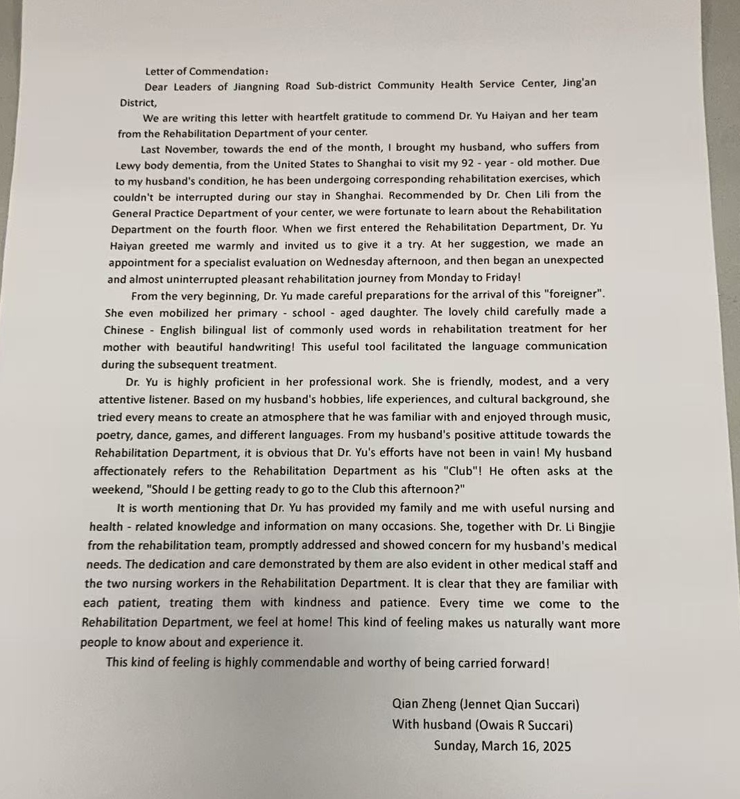 “没想到,中国上海的社区有这么好的康复治疗和设施,非常有幸能够体验到这个服务,为医院点赞。”