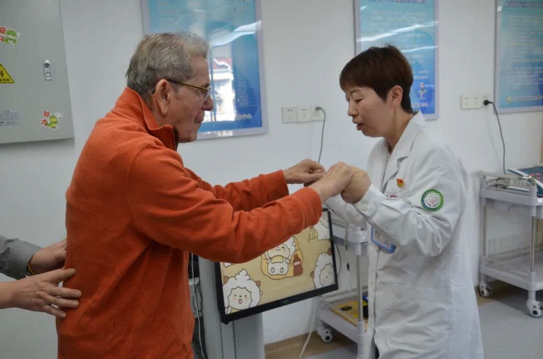 原来,去年11月下旬,Owais陪同妻子钱铮来沪探亲。Owais患帕金森病有7年多的时间,期间一直在进行康复治疗,妻子希望在沪期间Owais也能继续开展康复锻炼。起初,他们计划打车前往距离较远的康复医院进行治疗,经亲戚推荐,夫妻俩抱着试一试的心态前往江宁路街道社区卫生服务中心就诊。