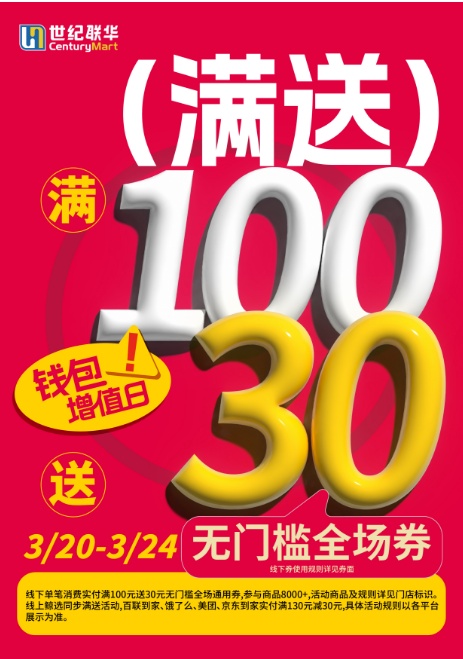 在3月20日至3月24日期间,世纪联华联合食品、日化、家百等领域品牌供应商,精挑细选8000余款商品让利,推出“钱包增值日”活动。消费者在上海世纪联华,单笔实付满100元,即可获赠30元无门槛全场通用券,活动品类涵盖:米面粮油、洗化纸品、休闲零食、饮料酒水、家用清洁和个护美妆等众多分类。