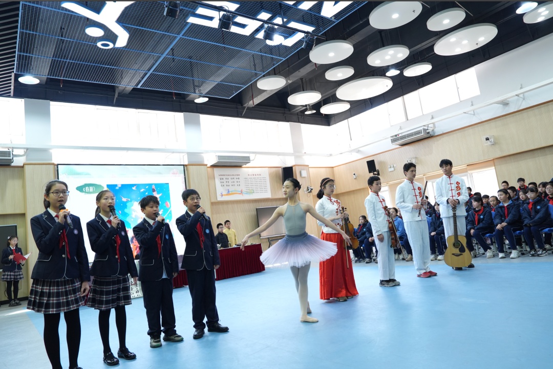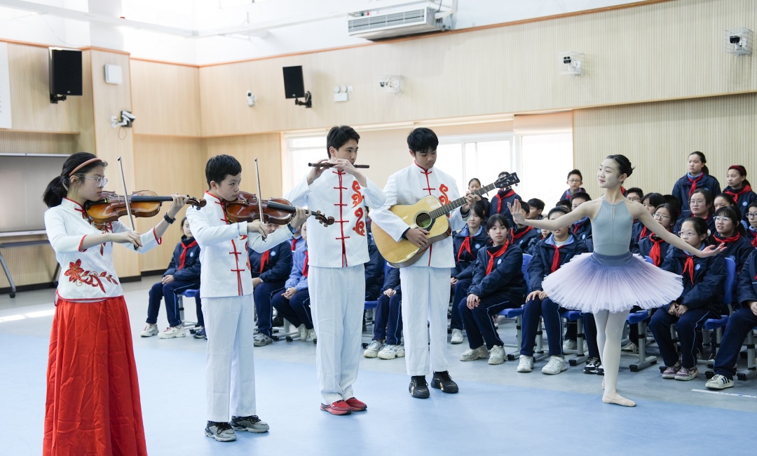 中西乐器交融,流淌出《大鱼》的优美音符;冲泡一杯象征春天的龙井茶,呈现出的是优美的茶艺演绎;墨韵丹青交织,勾勒的是国学新风,传承的是先贤美德;李叔同《春游》的歌声清亮,唱出春的礼赞……主题为“华章初启·艺境荣光”的首场“艺术午间”活动,凝聚了器乐、茶艺、书画、小组唱等丰富多元的艺术形式,为学生提供了展现才华和张扬个性的平台。升入初中的那个盛夏,男孩余思成邂逅了篆刻,被这种将文字与艺术相结合的形式所深深吸引。“每当拿起刻刀在石头上刻下属于自己的印记时,让我体会到什么是专注与耐心。”他把格致初级中学的校训“晓知明理,多才多艺”篆刻成一枚珍爱的作品,“在篆刻艺术中,我学会了脚踏实地,持之以恒。”在校长王珏看来,学习不仅是书本上的文化知识和简单的背诵做题,更包含了用艺术理解生命,用艺术感受美好生活。“希望更多同学成为格致的‘致多星’,也期待学校更多艺术团队和小艺术家亮相舞台,诠释对艺术与生活的热爱。”据了解,今后,“艺术午间”将陆续推出茶艺、音乐、绘画、舞蹈等专场,全方位展示学校全面和谐发展的育人样态。记者 / 王菁