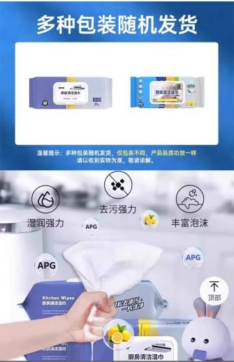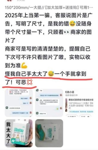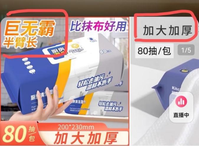 部分商家在商品页面中频繁使用“加大加厚”、“半臂长”、“加厚用一年”等夸张词汇来“洗脑”消费者。例如,在淘宝直播/点淘平台的“淘工厂致富达人”商品宣传页面中,就标注了“加大加厚”、“巨无霸”、“半臂长”等形容词来描述厨房清洁湿巾。然而,消费者收货后发现,湿巾的长度不足三分之一臂长,且展开后“薄如蝉翼”,长度和宽度仅与一手掌相当,与商家所描述的完全不符。