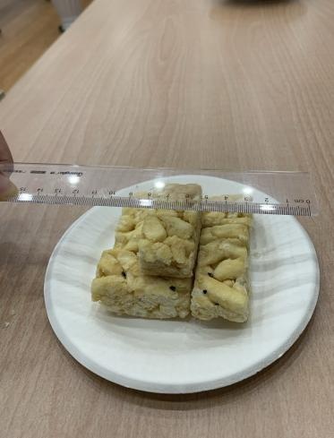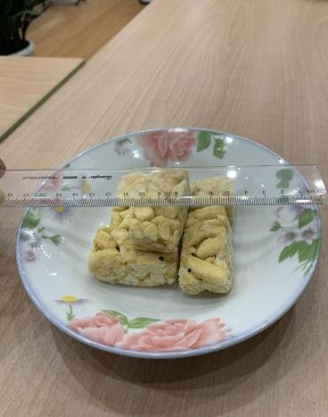 案例2:在视频号小店平台的“糕博士工厂店”直播镜头中,5块无蔗糖山药味沙琪玛看起来能装满满一盘。然而,体察员收到商品后尝试用这5块沙琪玛装盘,却发现无法达到直播中的效果。为了验证这一点,我们通过网上搜索得知,一般认为盘子最小的直径为6寸(约15.24厘米),低于该尺寸的通常被称为碟子。于是,我们分别使用了一次性约15厘米直径的盘子和日常约18厘米直径的盘子进行分装对比,结果发现都无法复现直播中的“满盘效果”。