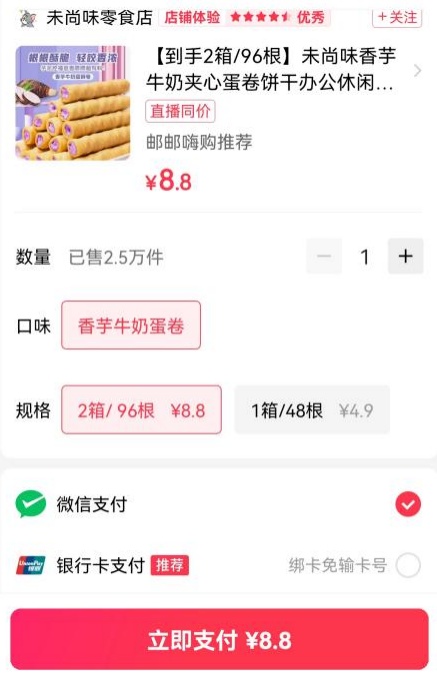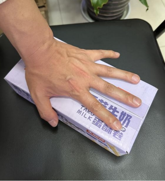 在通常的理解中,“箱子”指的是较大的容器,而“盒子”则泛指较小的容器。在体察过程中,以快手电商平台上“未尚味零食店”售卖的香芋牛奶蛋酥卷为例,主播在直播视频中多次使用“箱”进行宣传,页面文字也采用了“箱”作为计量单位,这很容易让消费者忽略商品净含量后面的“g”(克)标注。然而,体察员实际收到的却是一个仅略大于一个手掌大小的盒子。
