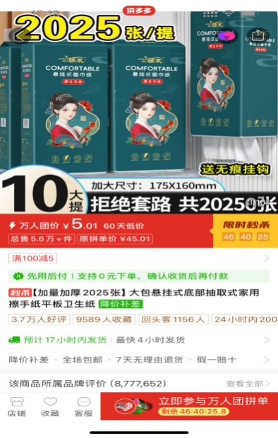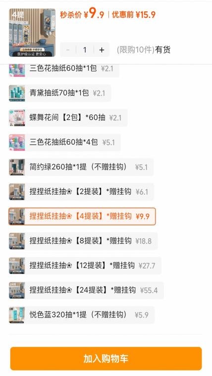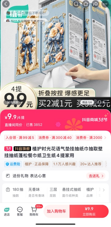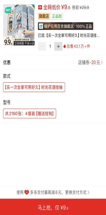 在体察过程中,多多平台的“植护日用百货旗舰店”引流视频中宣称时光花语纸面巾“4提到手才9.9元”。体察员进入下单页面后,发现商品标注的“券前”价格为29.9元/4提,但店家提供了一张20元的大额优惠券。在如此大的价格优惠诱惑下,体察员毫不犹豫地下了单。然而,后续在其他平台进行体察时,体察员发现同款产品的4提价格直接就是9.9元,无需使用任何优惠券。