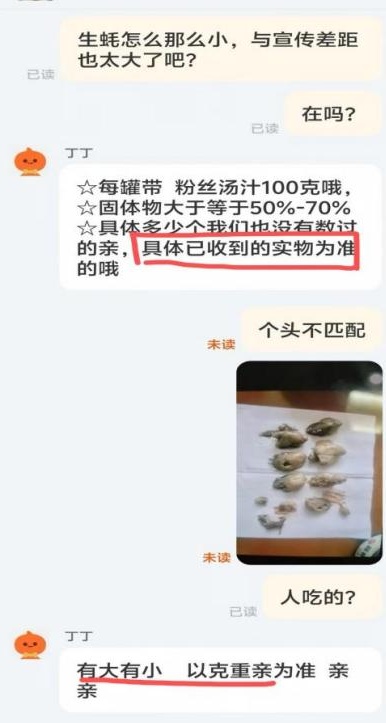 案例3:在淘宝直播/点淘平台的“良心乐旗舰店”引流视频中,商家展示的麻辣肥蚝大罐装看起来极具诱惑力,无论是罐头的深度、颜色色泽,还是生蚝的大小,都让人垂涎欲滴,激发了消费者的购买欲。然而,当消费者收到货后发现,罐头的直径仅有8.5厘米,高度4.2厘米,与视频中的展示大相径庭。开罐后,映入眼帘的是七八个又小又黑又碎、毫无食欲的生蚝,更令人意外的是,底下还铺着一层厚厚的粉丝。