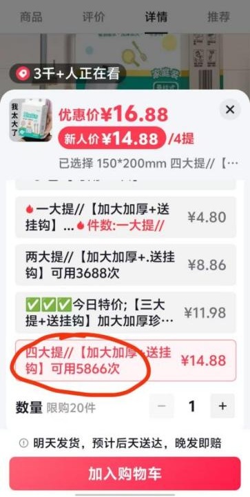 在多多直播平台的“信捷日化专营店”中,主播视频销售臻木悬挂式面巾纸时宣称每包产品含有“2025张”。然而,体察员收到产品后发现,外包装上仅标注了产品规格为160mm*175mm,并未提及“2025张”等任何关于张数的描述。出于好奇和验证的目的,体察员耐心地对实物的实际张数进行了仔细确认,结果发现总抽数约为240抽,且每抽纸由2张纸张紧紧贴合在一起,因此实际总量仅为480张,与主播的宣传存在明显差异。