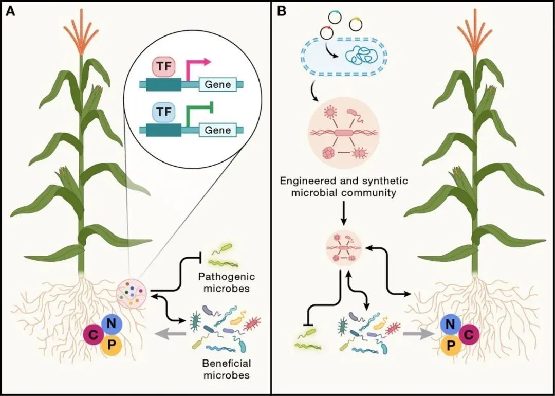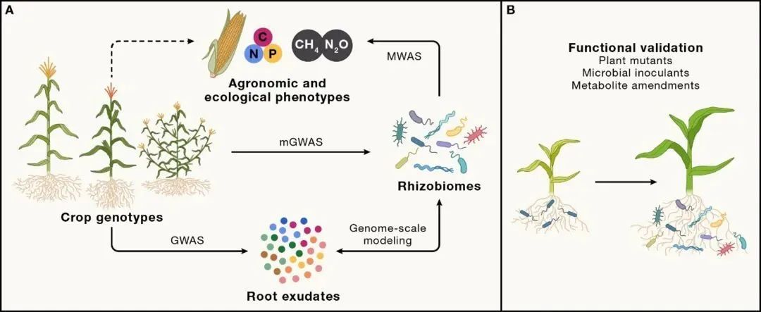 植物与其相关的微生物共同构成了共生功能体(holobiont),这一复杂系统不仅在促进宿主生长、增强胁迫抗性方面发挥关键作用,还深刻影响着养分循环、污染物转化及土壤碳固存等生态过程。文章详细阐述了通过共生基因组培育气候智能型作物的实施路线:一方面,通过植物育种调控根系分泌物,进而改变根际微生物组的功能;另一方面,设计合成微生物群落(synthetic community)或通过基因改造优化微生物功能,实现跨界信号传导,以定向调控共生功能体。这些策略旨在优化养分循环、提高植物抗性并加速土壤碳固存。此外,文章还探讨了研究植物-微生物互作分子机制所面临的挑战,包括其对特定表型贡献的不确定性,以及在农业应用中的潜在局限性。文章强调将农业管理措施与精准微生物组工程相结合,从而实现不同环境背景下植物-微生物相互作用的有效调控。将微生物介导的生态功能整合为新型植物性状,培育气候智能型作物,有望为应对粮食危机、环境污染和气候变化等全球性挑战提供植物解决方案。