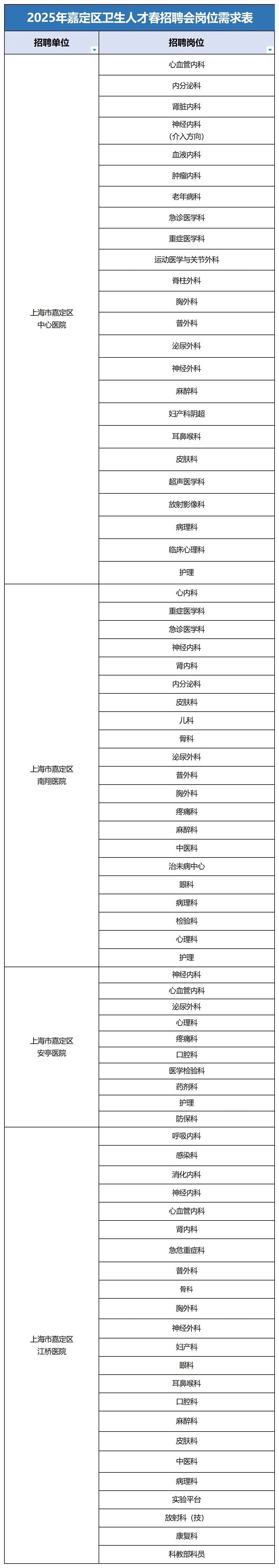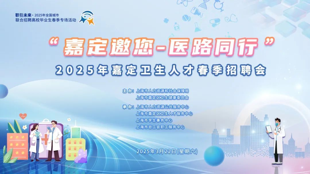 “五大新城”之一的嘉定新城是上海市嘉定区未来发展的核心,正全力打造现代化新型城市。新城的建设不仅提升了嘉定区的整体发展水平,也为嘉定区的经济转型、城市更新和人口集聚提供了重要支撑。为满足与之相匹配的医疗卫生人才需求,特举办“嘉定邀您·医路同行”卫生人才春季招聘会,届时有24家公立医疗卫生单位推出200多个岗位,面向社会公开招聘各类医学专业人才。