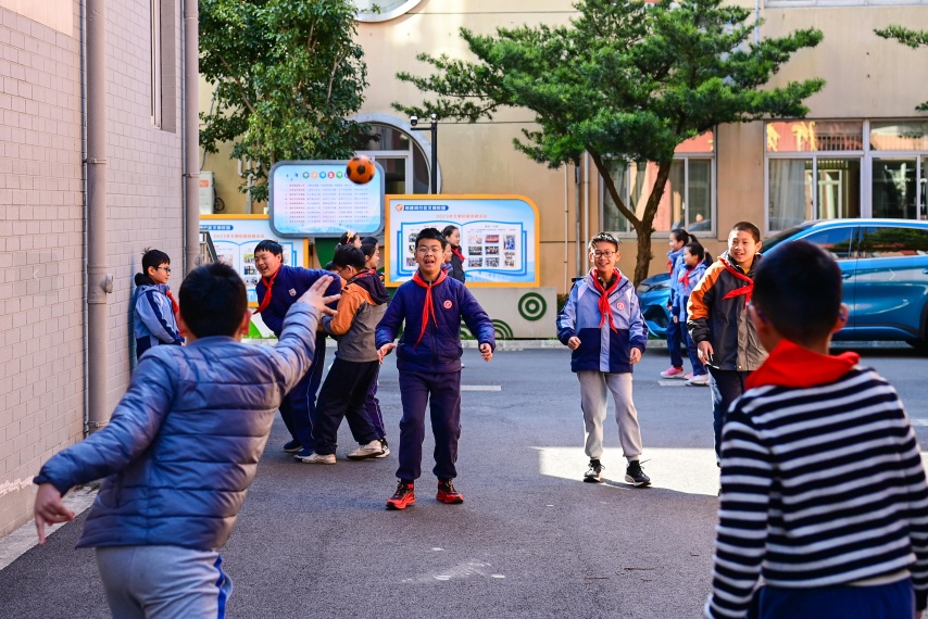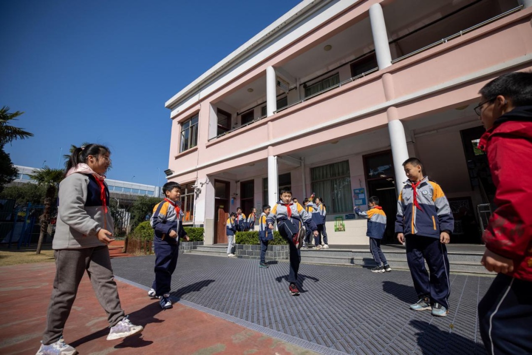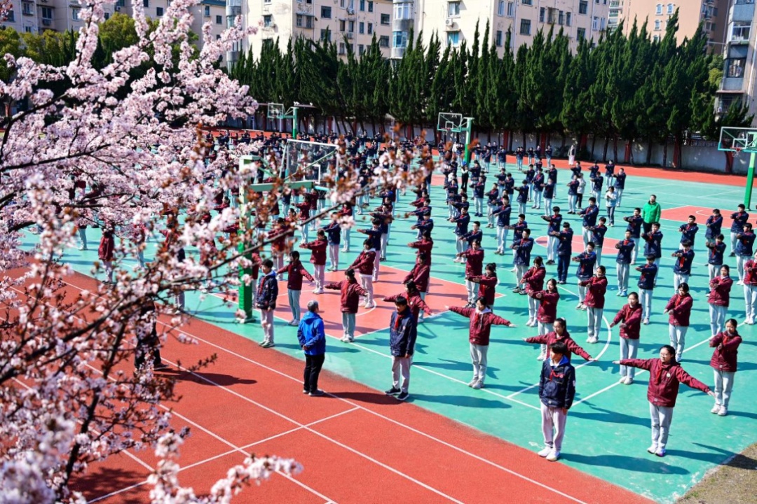 华东理工大学附属闵行梅陇实验学校充分利用校园的每一个空间开展体育大课间活动,做操、踢毽子、跳绳、体育游戏……同学们在校园的各个角落尽情舒展,活力满满。