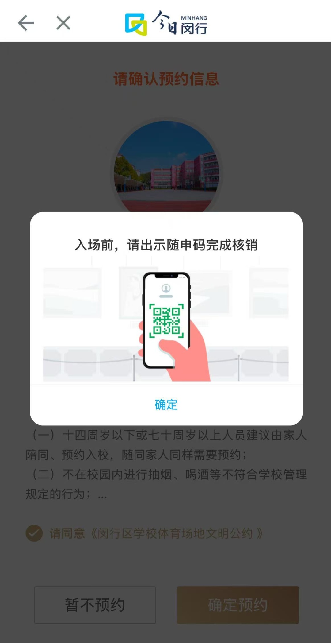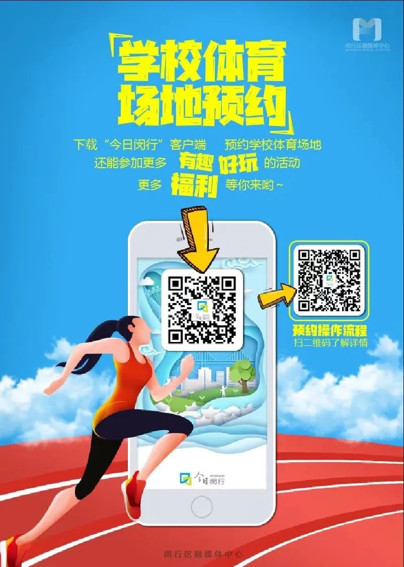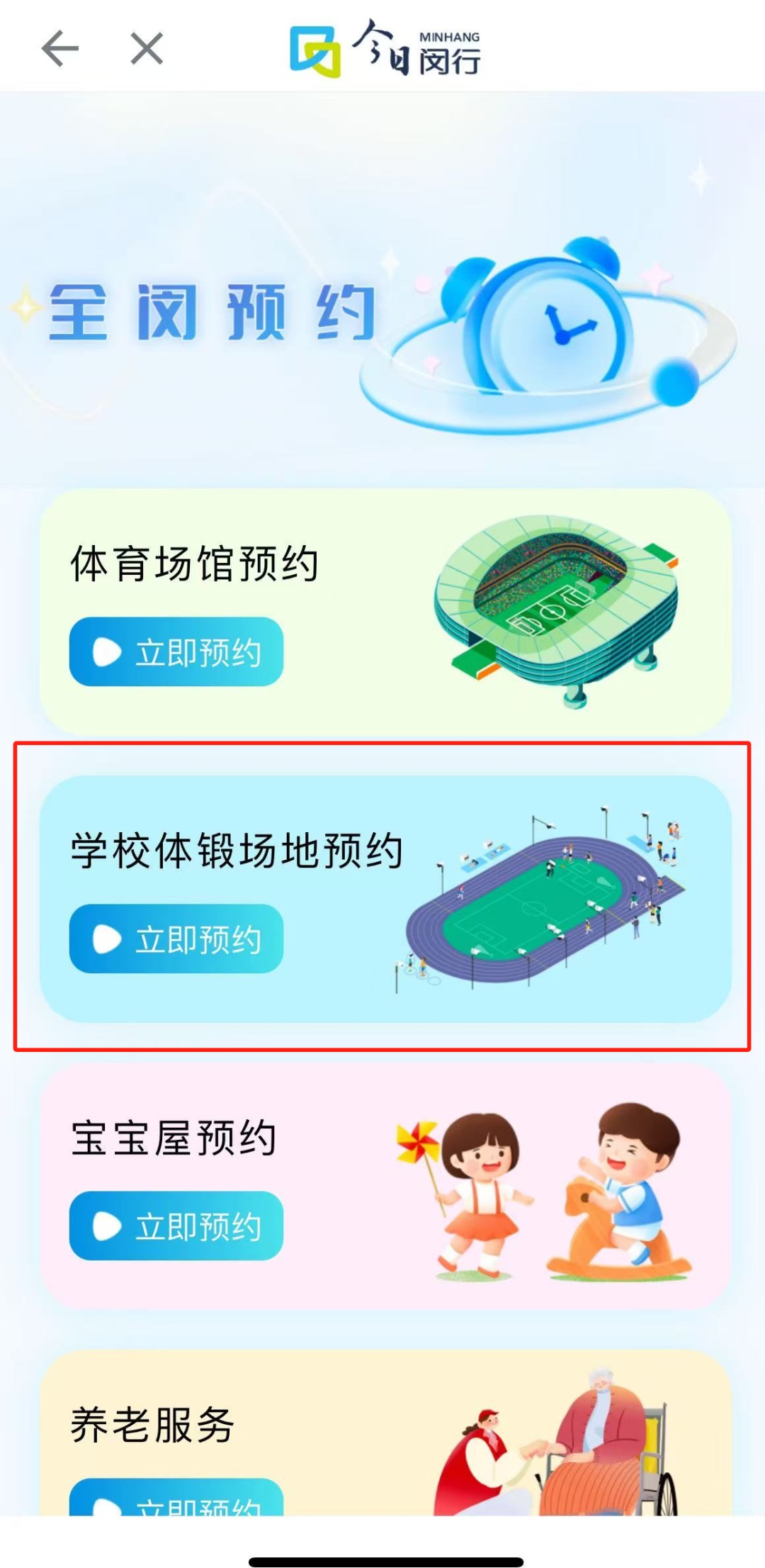 2.在“今日闵行”客户端首页,依次点击“全闵预约”—“学校体锻场地预约”。