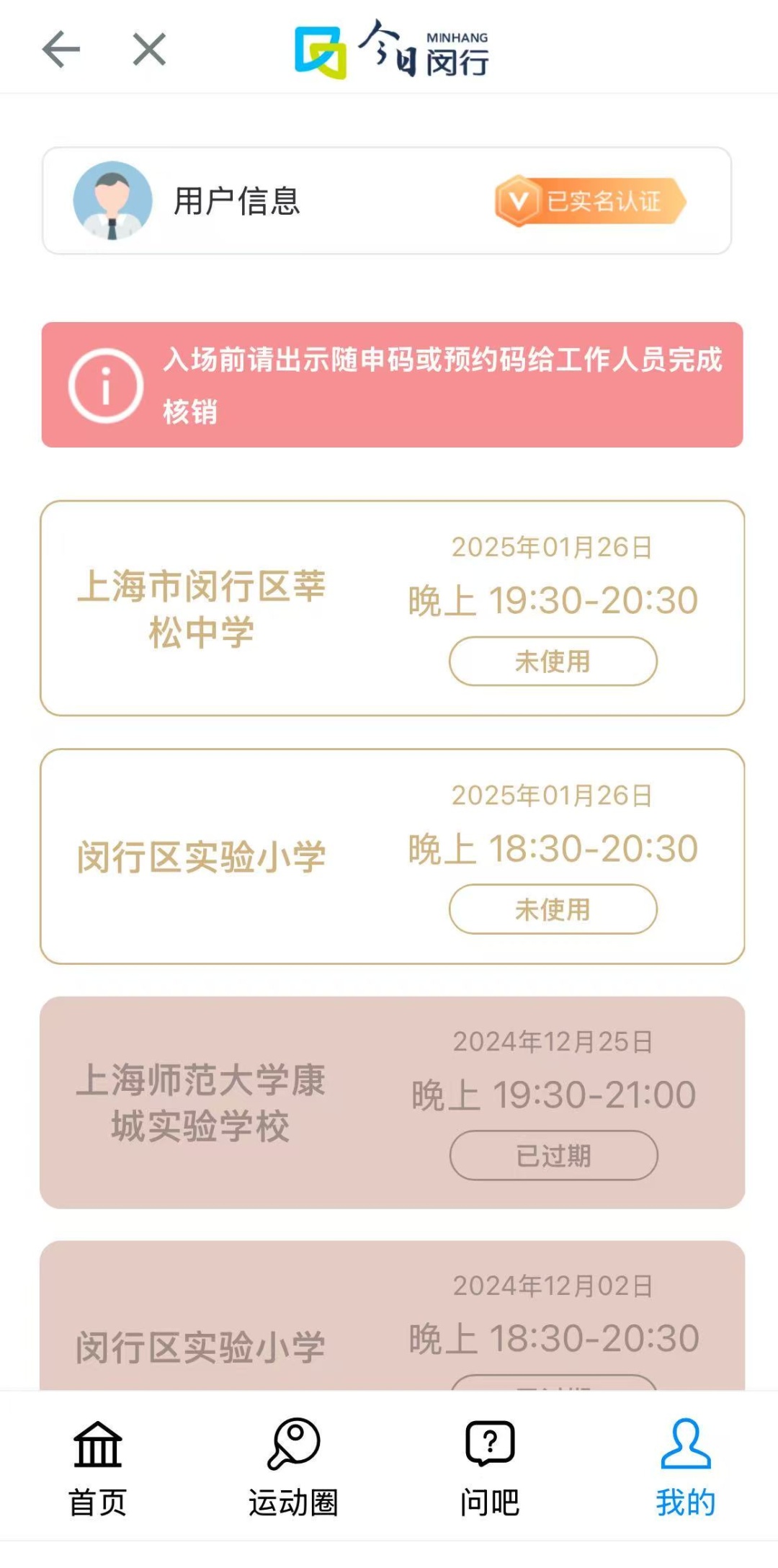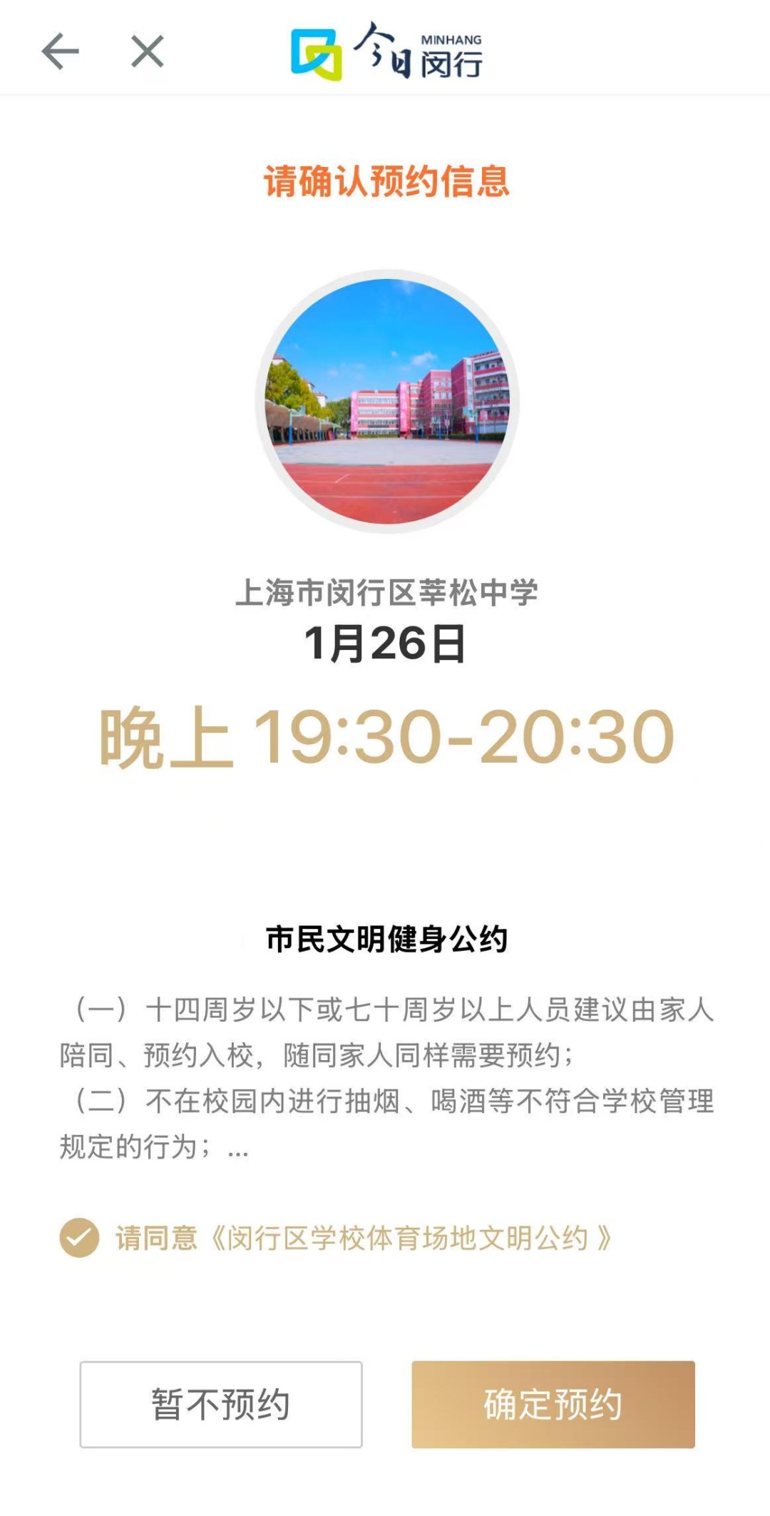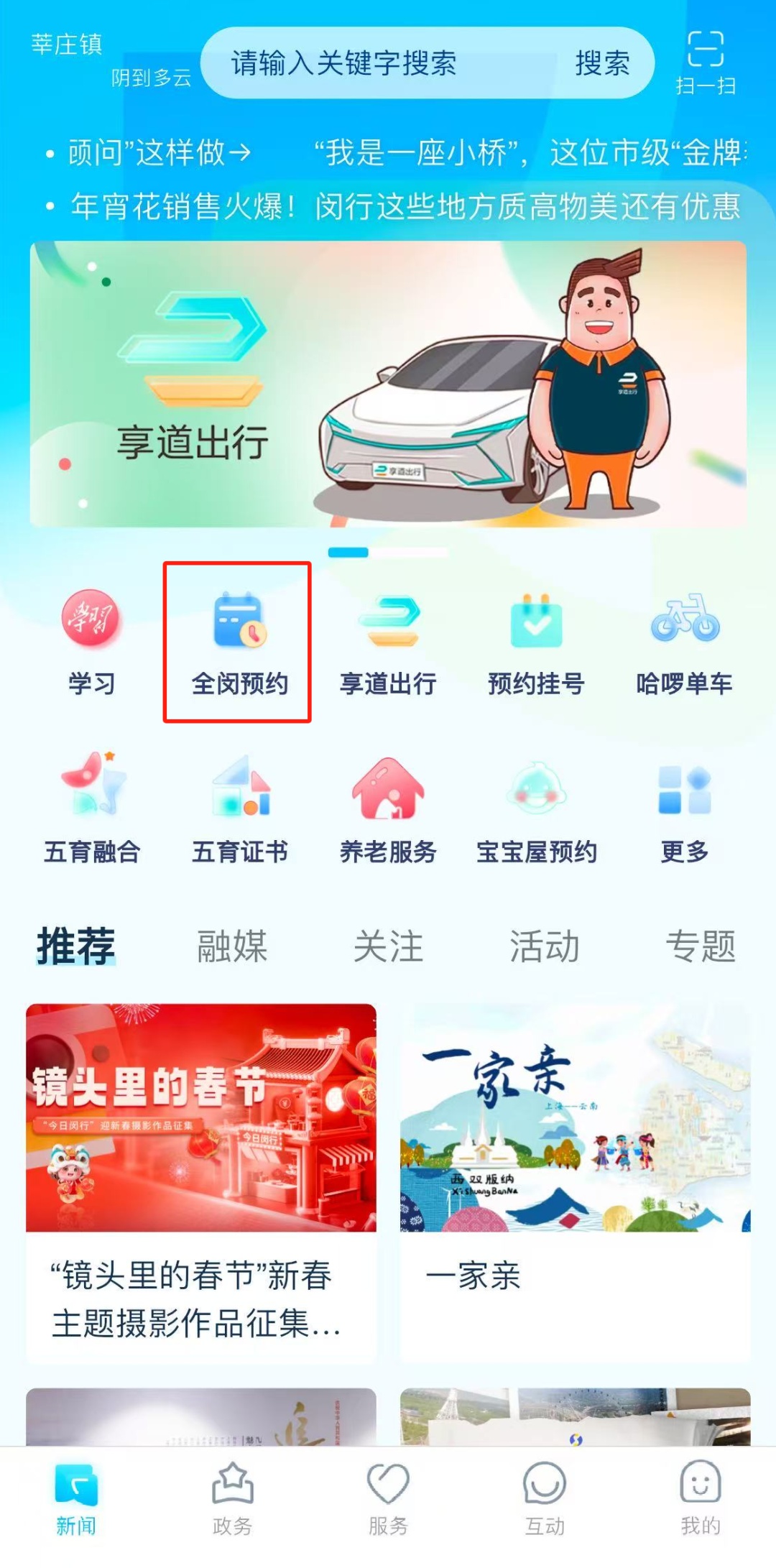 2.在“今日闵行”客户端首页,依次点击“全闵预约”—“学校体锻场地预约”。