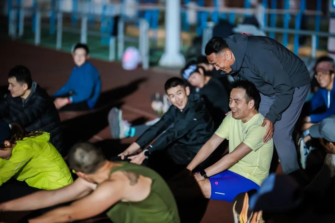 王教练在帮助配速员拉伸