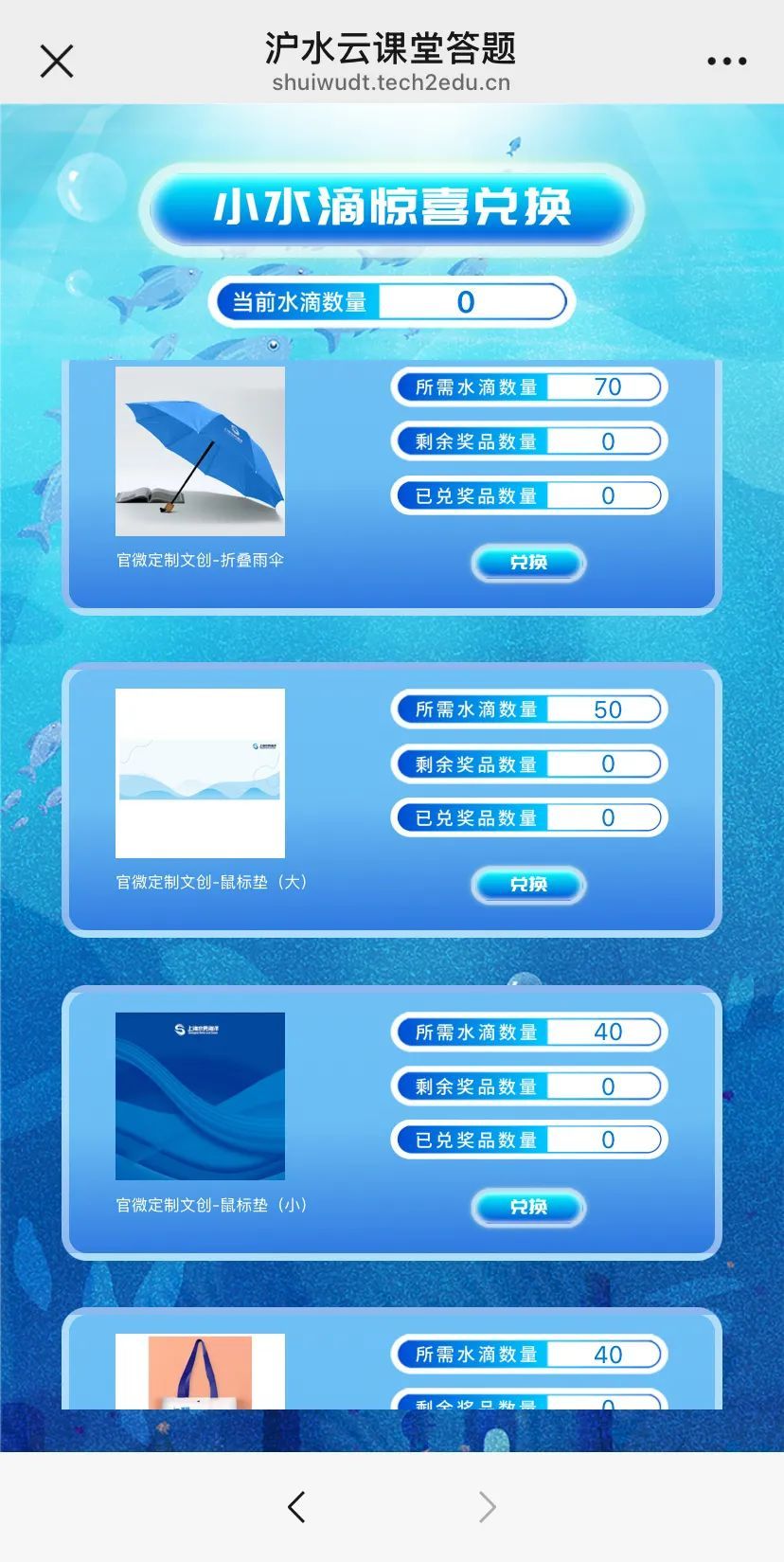 1、小水滴“惊喜兑换”页面中,上下滑动查看相应奖品,点击“兑换”,消耗相应数量的水滴,即可实现兑换;