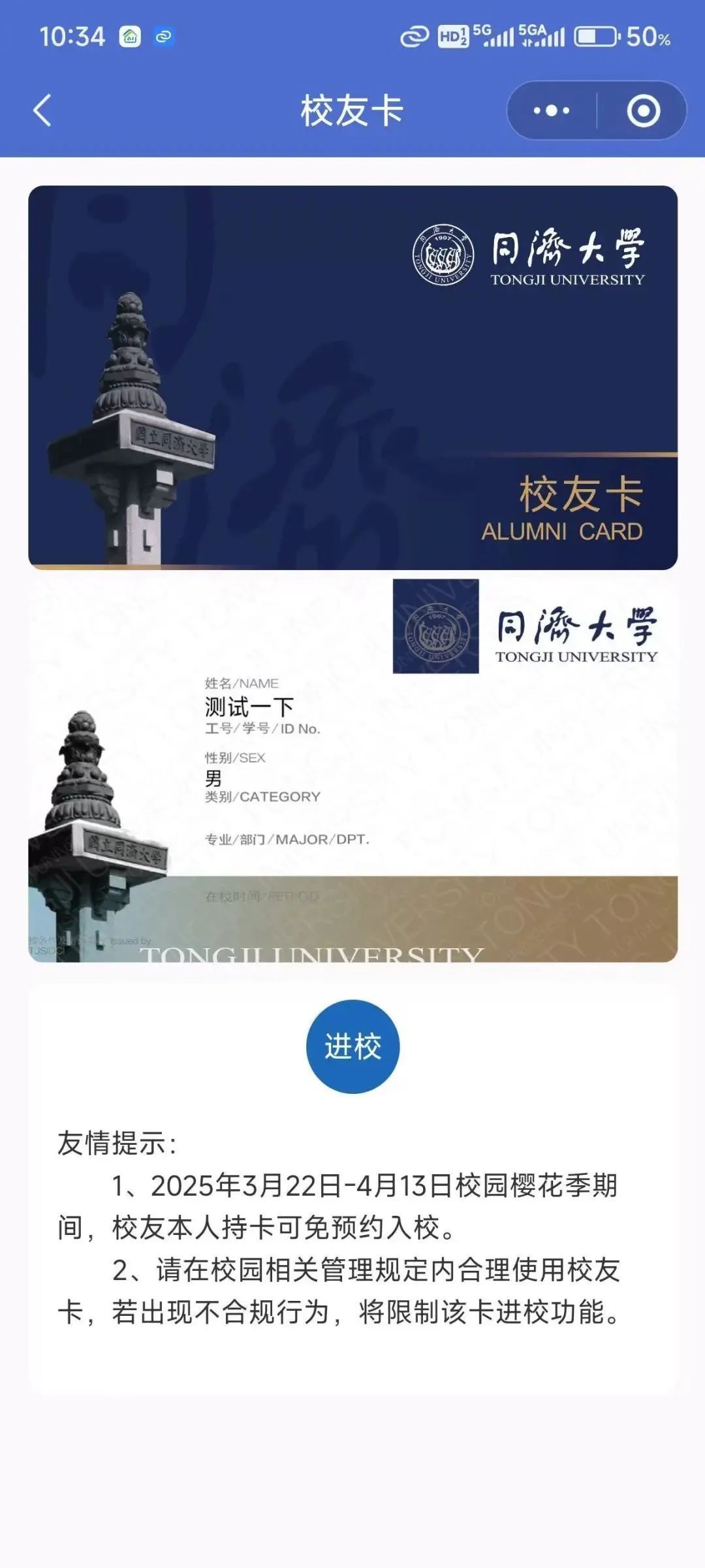 樱花开放期间,校友凭同济大学电子校友卡可直接步行进入四平路校区,无需预约(仅限校友本人使用)。